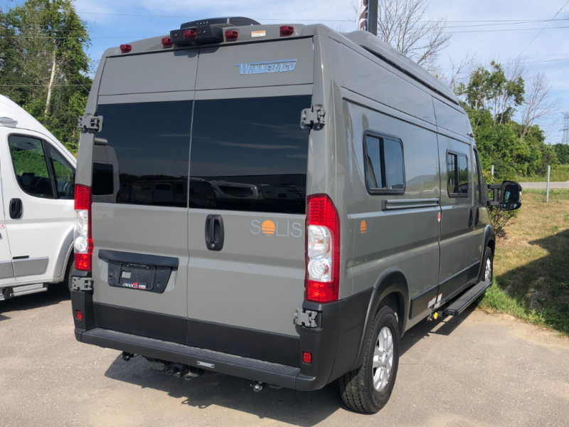 Each Solis Class B gas motorhome by Winnebago sits upon a fuel-efficient Ram ProMaster chassis with a 3.6L V6 engine to power your adventures. You will love the cab conveniences that make each trip enjoyable, like the digital review mirror, the radio/review monitor system touchscreen, and the crosswind assist to keep you steady on the road. Some of the hassle-free amenities you will appreciate are the exterior wash station, the Eco-Hot water system, and the water center control panel located inside the right rear door. Head indoors to find heavy-duty vinyl flooring throughout, a laminate countertop and a stainless steel sink in the galley, plus tinted coach windows for added privacy. The Solis also features off-grid capabilities with its two deep-cycle Group 31 batteries and 220-watt flexible surface solar panel with a controller. Adventures awaits in the Solis Class B gas motorhome!