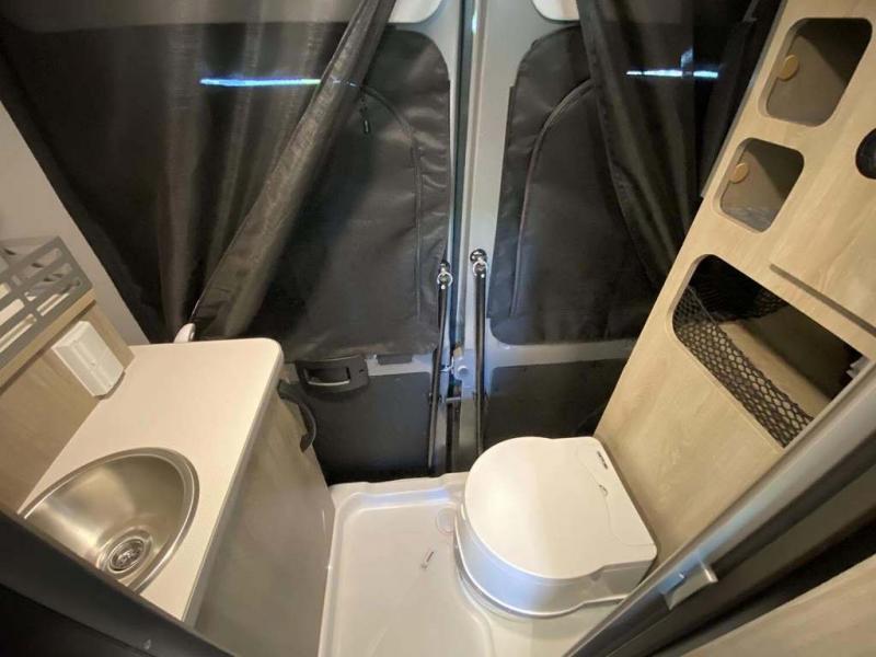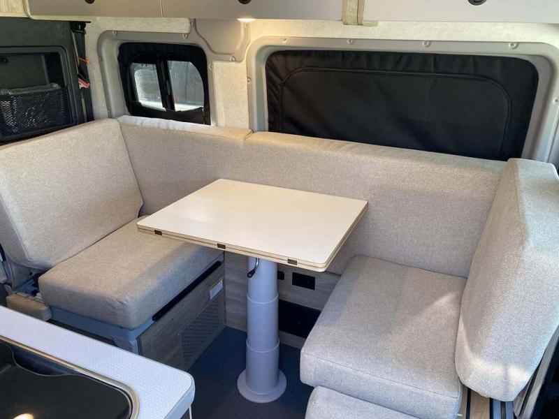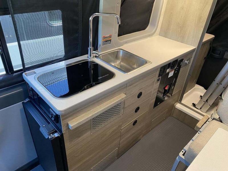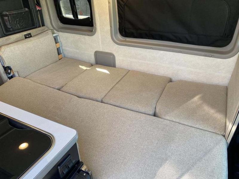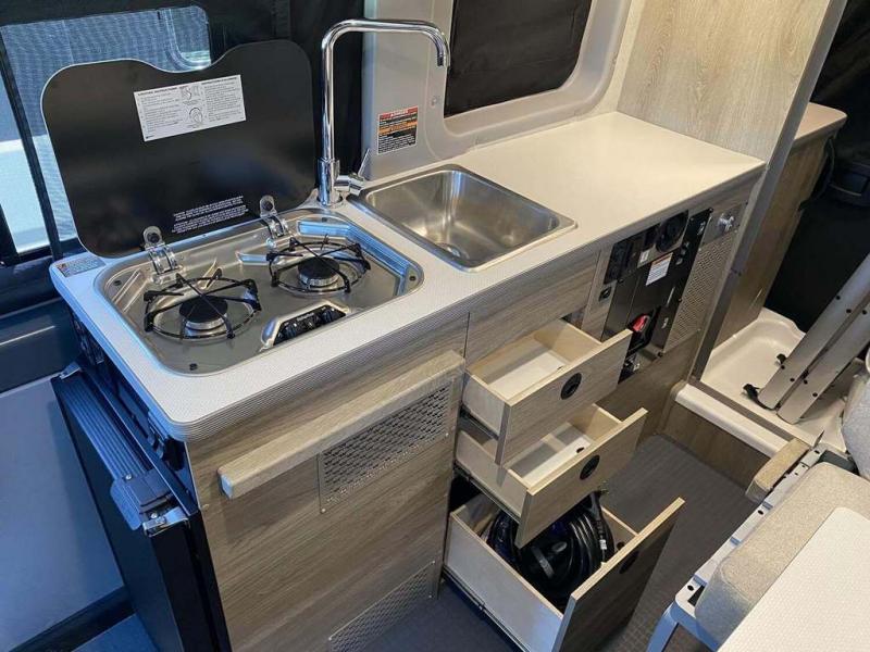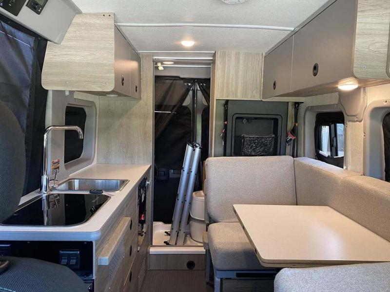 This camper van is perfect for independent travel or if you've got a camping partner to take along with you! The convertible dinette bed can transform into a twin-size bed for one or a double-size bed for two. The three seating modes include a belt mode, sofa mode, or lounge mode for even more comfort. You will find all you need in the kitchen to prepare meals each day, including a two burner range with a glass cover for more counter space and a 3.0 cu. ft. 12V single door compressor-driven refrigerator/freezer for food storage. There is a shower with a wall surround in the rear wet bath, along with a removable cassette toilet, a medicine cabinet with a mirror, and a wardrobe cabinet with added storage. This space could also be used as a mudroom after a day of exploring, or utilize it for storage!