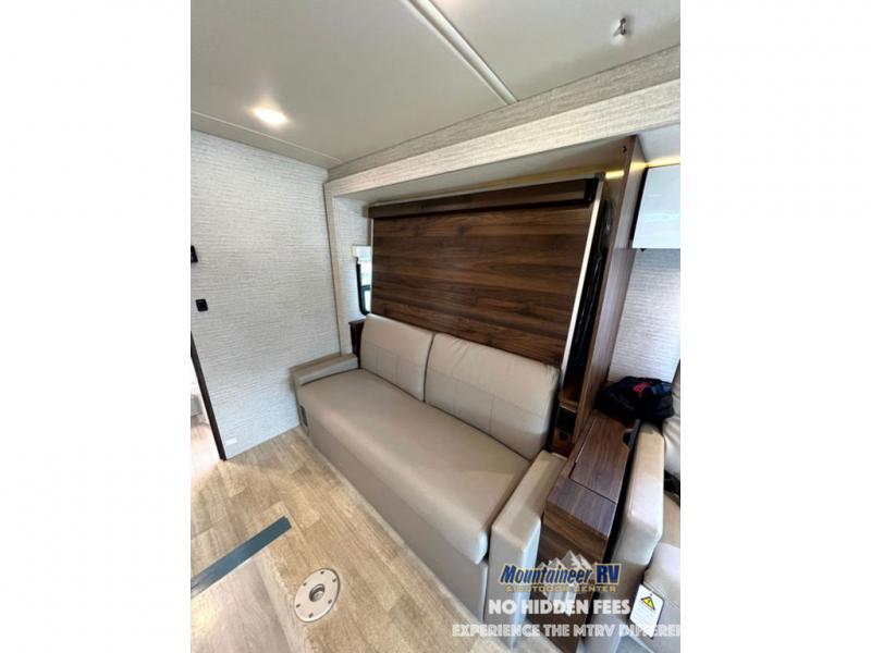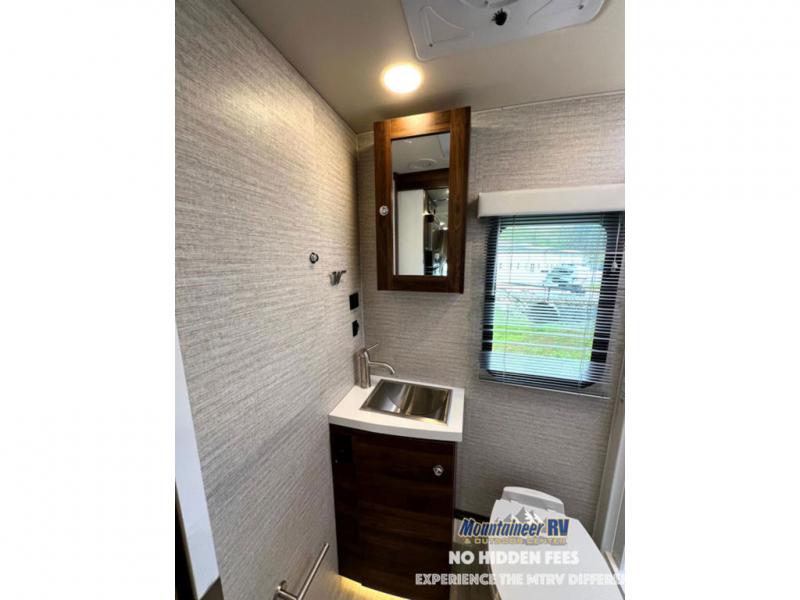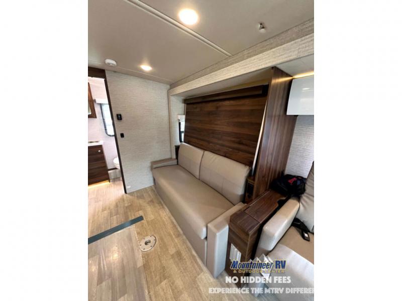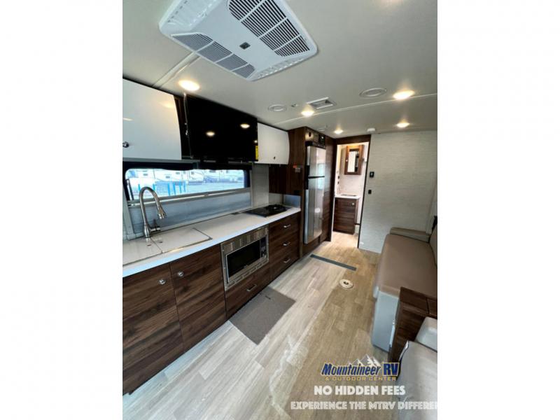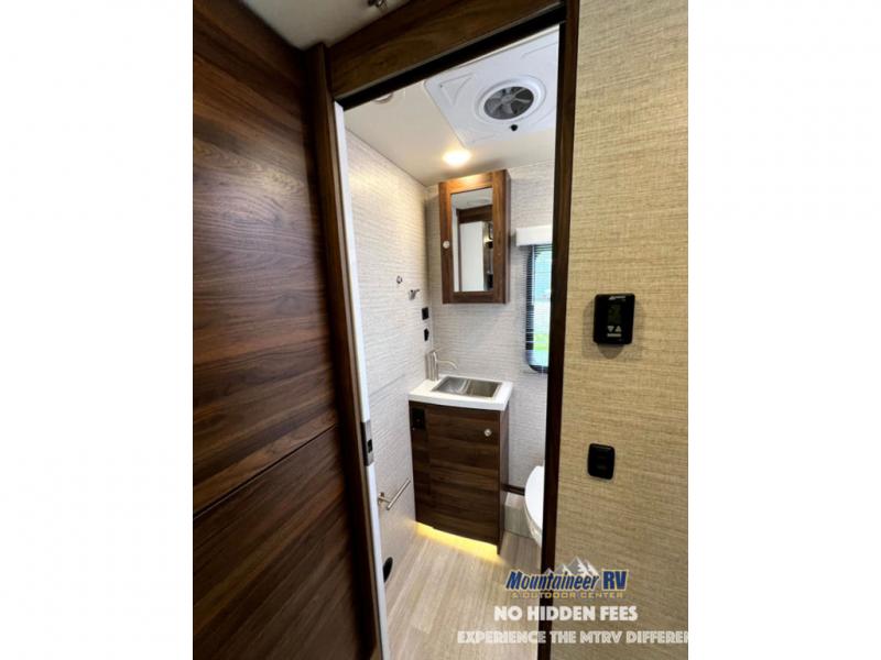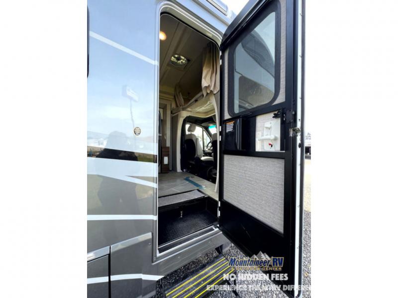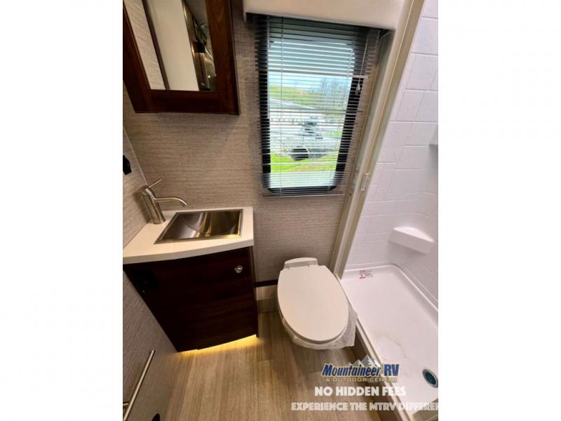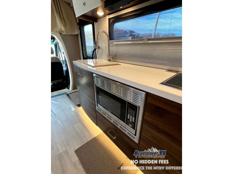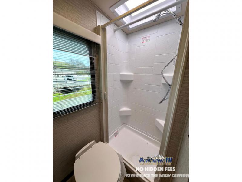 A couple or family will enjoy the look of the interior each time they take this View Class C diesel motorhome on the road. With the curved cabinets, the lighted soft-close galley drawers, and the sprung-cushion dinette and sofa seats, there will surely be a favorite feature for everyone. You will be able to easily set up the queen Murphy+ bed when it's time for bedtime while the kids sleep on the bunk above the cab or the U-shaped dinette. You might like to add the theater seating option with swivel tables if you don't need that extra sleeping space. Everyone can get cleaned up in the full rear bathroom that has a space-saving sliding door before making meals with full kitchen amenities including a convection microwave/oven.
