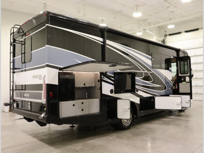 We now offer America’s best selling class A gas floorplan with a full wall slide, exterior entertainment, and outside tailgate package in the luxurious Vista and Sunstar model!