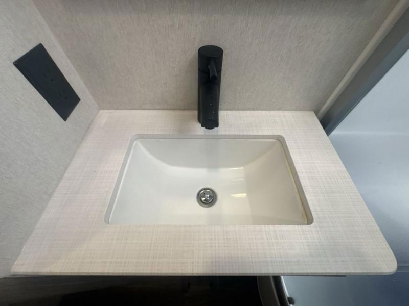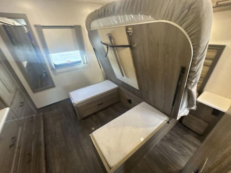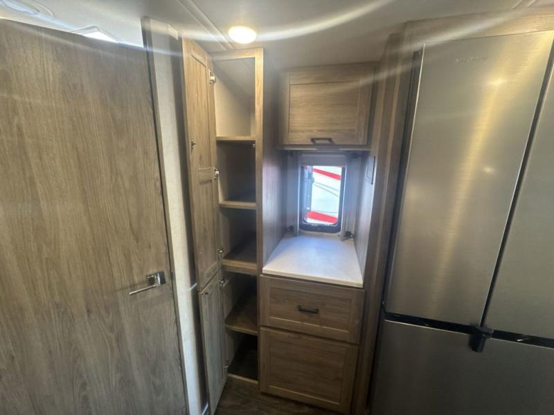 x 75" king Murphy bed that folds down and when it's stored away there is a dinette workstation for you to get some work done in comfort, plus wardrobes on either side of a dresser and an entrance into the dual entry bathroom. Across from the bathroom is a large pantry with exterior storage access for your convenience. The chef will have an easy time preparing delicious meals in the fully equipped kitchen, and they can be enjoyed at the 42" x 95" U-shaped dinette slide. The 40" x 66" sofa bed is not only great for relaxing while watching a movie on the 39" LCD HDTV, but also for transforming into an extra sleeping space. If you need more sleeping space, you can also add the optional 50" x 80" powered StudioLoft bed above the cab!