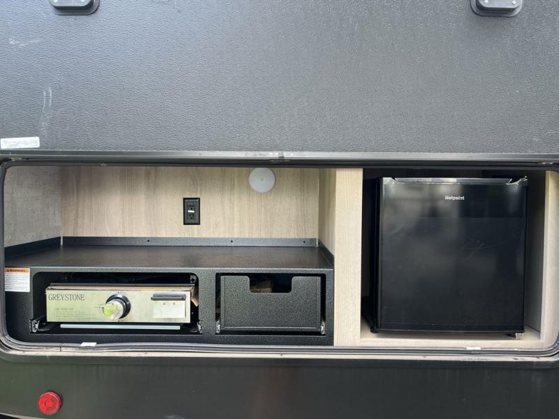 Your adventures are going to be the greatest that they can be with this Voyage travel trailer! You'll want to sleep in a little bit longer each morning since you will have your own private bedroom in the front, and since the bedroom has the second exterior entry door, you can come and go as you please. Your guests or your kids will also have a comfortable place to spend the night with double-size bunks in the back. And if you do happen to have even more people traveling with you, there is a tri-fold sofa and booth dinette that can provide you with additional sleeping space once converted. The indoor kitchen is fully equipped with a recessed three-burner cooktop and convection microwave for delicious meals, but there is also an exterior kitchen that you can use for some summertime fun. Here you will find a pull-out griddle, a 1.6 cu. ft. refrigerator, and storage drawer for your cooking utensils and more.