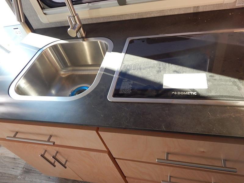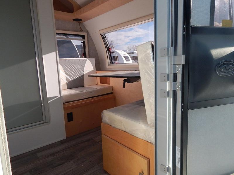 This Little Guy teardrop trailer has an impressive 6' 7" interior height, so even though your trailer is little, you don't have to be little to enjoy it. The large pass-through storage compartment gives you more space to bring along extra gear, and the 2" rear receiver can hold bike racks or storage racks. The exterior entertainment center comes with a TV mount, two 5" outdoor speakers, and HDMI, Coax, and power outlets. There is an RV king size bed at 76" x 81", or you can convert it into two 28" x 76" twins if you prefer, and there is storage along both sides, along with a closet for your things. There is an 8 cu. ft. 12-volt refrigerator, stove and sink, plus a pantry for food storage and all of your indoor cooking needs. Enjoy meals at the front dinette which features storage along all sides and can easily be converted into sleeping space for one more. If you add the optional Rough Rider Package, you can get 15" off-road tires and wheels and a 2.5" axle riser for added clearance. There is a dry weight ranging from 3,060-3,140 lbs. on this model, and a GVWR ranging from 4,000-4,200 lbs.