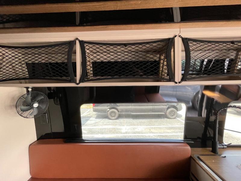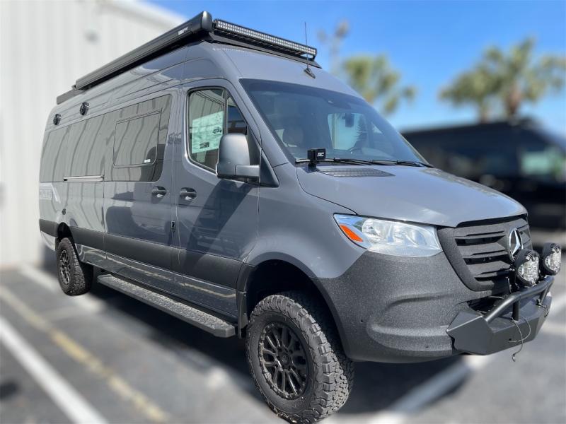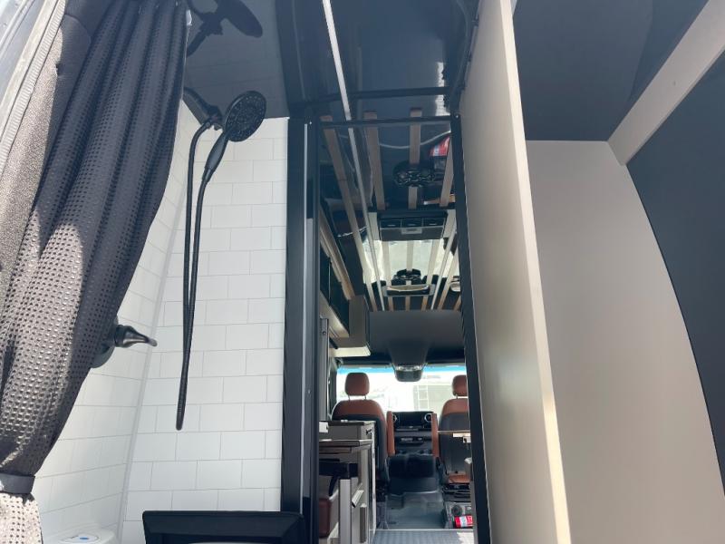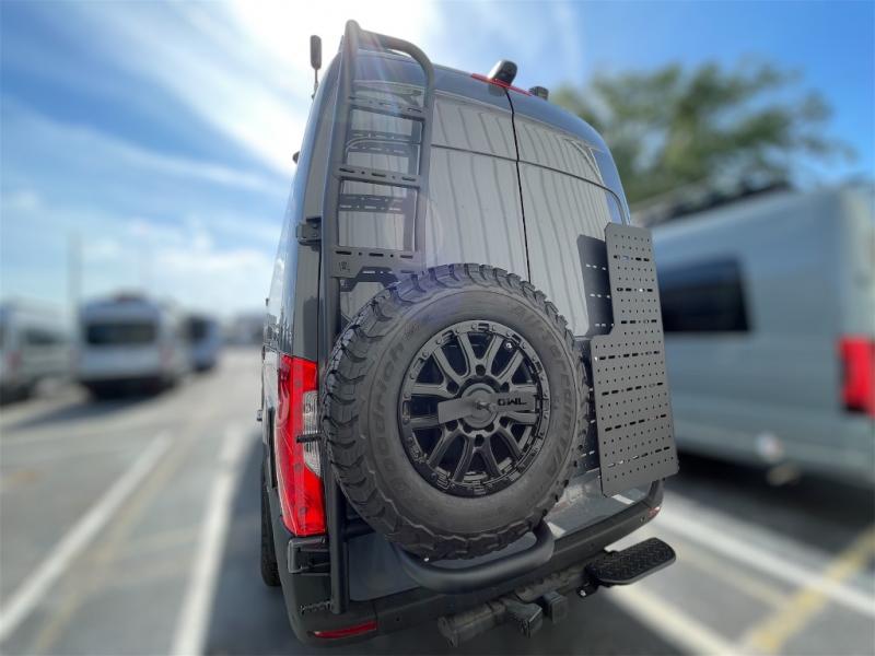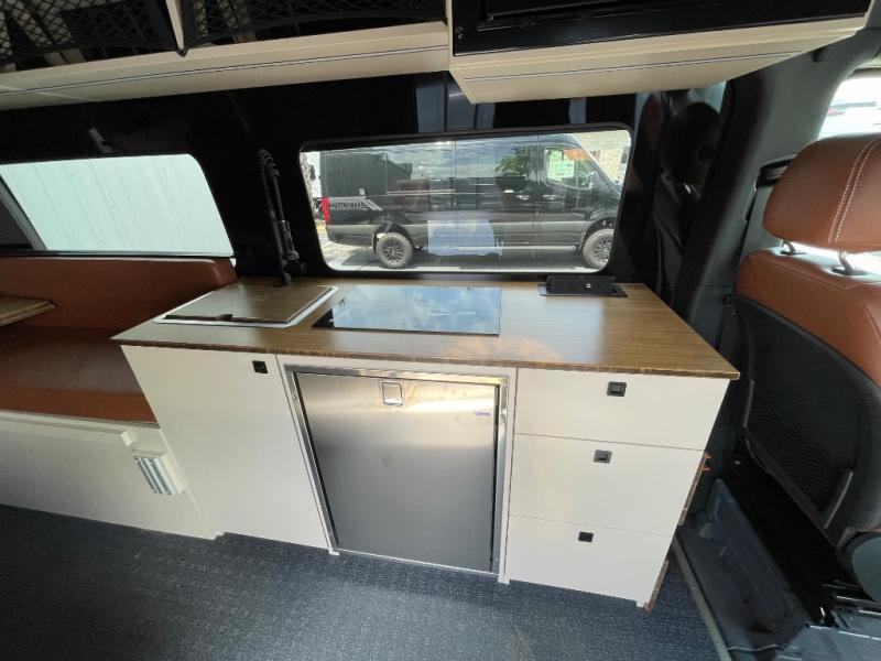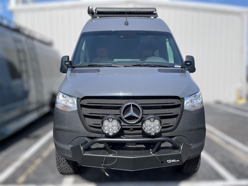 This van features a 170" wheelbase that is ready for adventure when you are! The 170" WB differs from the 144" WB in that it features a wet bath with a cassette toilet, a pantry/wardrobe/storage, plus a gear garage with dual bike racks! The four-wheel drive means you can conquer tough terrain since there are off-road tires, a Nomad Sprinter rear bumper for added protection, and a 3-POD LED light bar that provides up to 10,000 lumens of light output. Inside, you'll find a fishing rod rack, bug screens, and LED accent lighting. The leather dinette converts to a bed/sleeping area where you can dine each day and sleep soundly. In the morning, you can prepare breakfast on the dual burner induction cooktop or in the microwave oven, plus there is an Isotherm drawer refrigerator/freezer for your perishables. You will also love the outdoor shower to wash off your bike or hiking gear, along with a gear garage and a ladder to access the roof!
