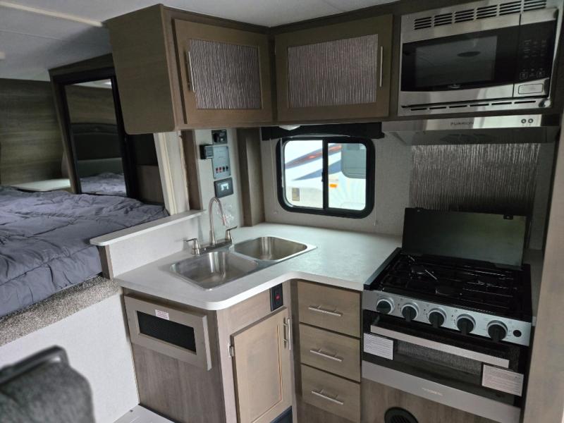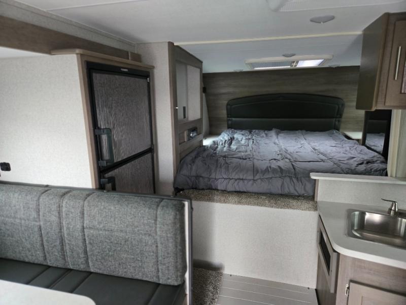 You won't believe the amount of space you'll find in this truck camper that can sleep three to four each night! There is a slide out with a refrigerator and a Dream Dinette that will also convert to a bed for guests. The front queen bed will provide a great night's rest, and you'll enjoy two nightstands, one with a drawer to keep your valuable close by. There is even an entertainment cabinet if you want to add an optional TV! Whip up your best meals with the three burner cooktop and large stainless steel oven, then store leftovers in the 7 cu. ft. Dometic 2-door stainless steel refrigerator/freezer. The seamless one-piece fiberglass wet bath is another feature you are sure to appreciate with its Dometic toilet, dual layer skylight, and 12V power exhaust fan. This model also includes the mandatory Elite Option Package that comes with a 26" friction hinge door with a dead bolt and screen, a 4-season insulation package, LED lights both inside and out, plus more!
