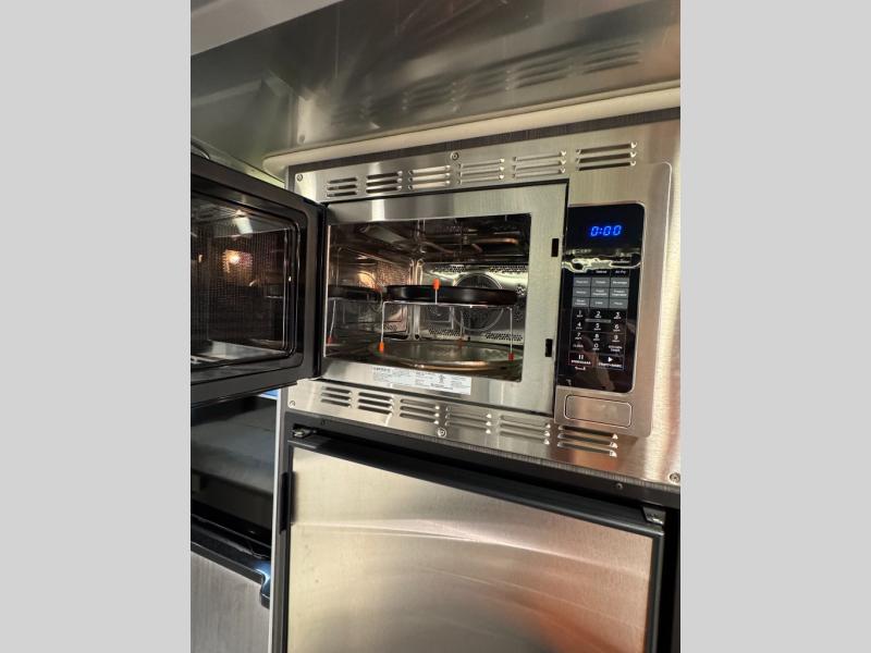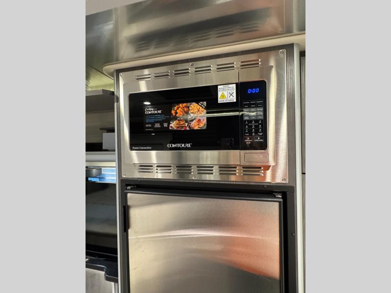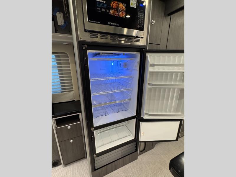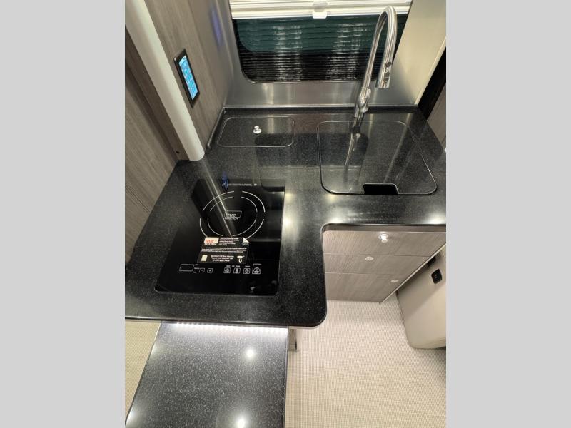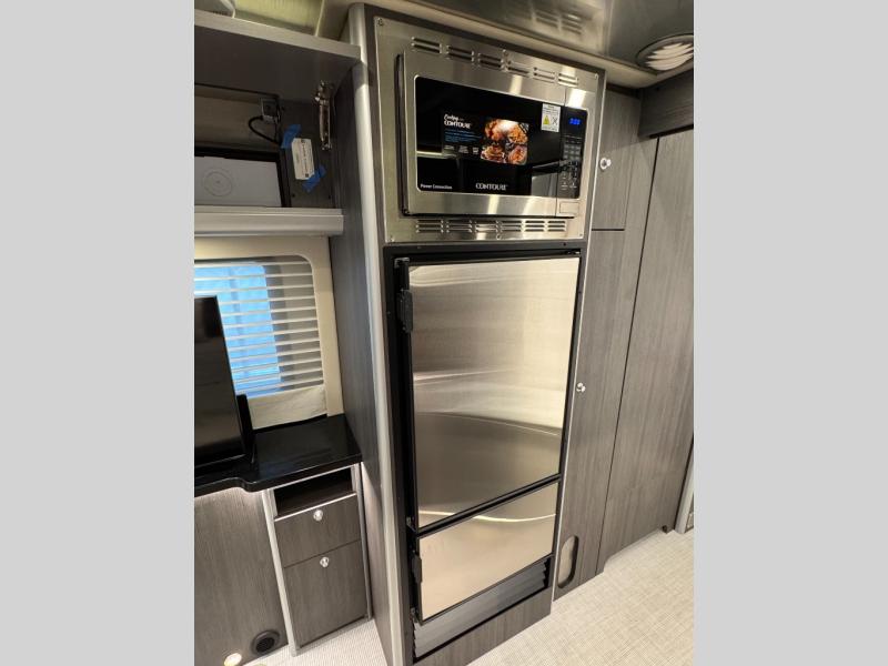 Premium Kitchen Setup: Whip up meals in a gourmet galley featuring a convection microwave, two-burner gas cooktop, solid surface countertops, and a large refrigerator—all with high-end Airstream finishes.