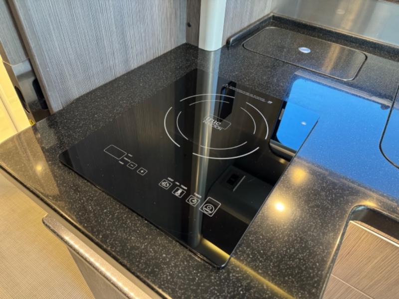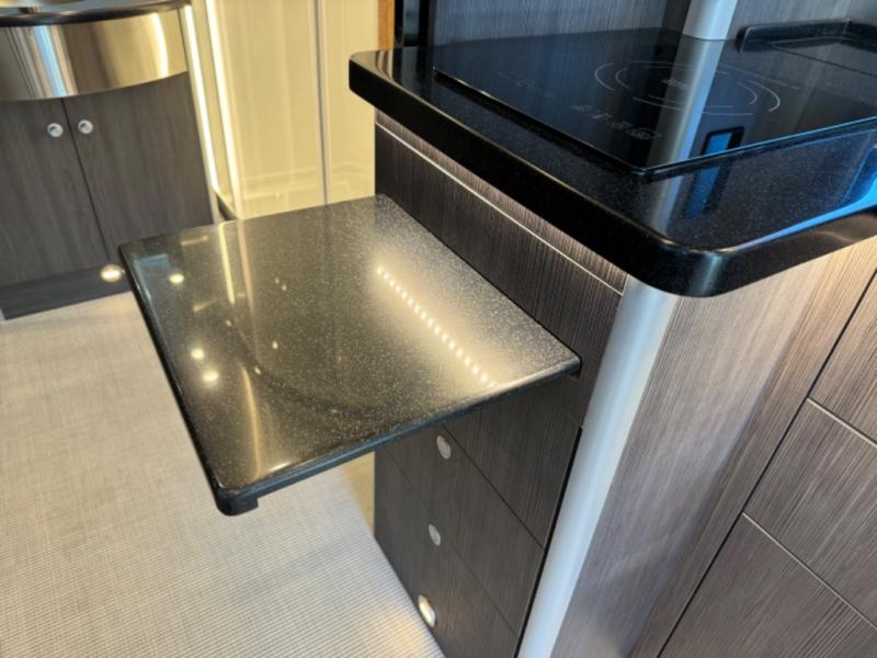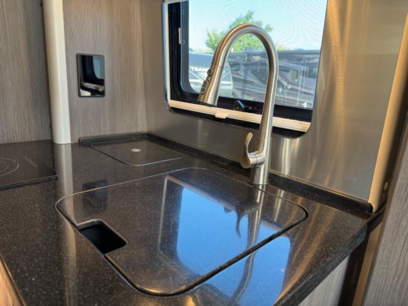 Get ready to explore, unwind and "glamp" where ever you decide! This coach brings you everything you will need, plus much much more! The power slide offers a Murphy suite that retracts and fits seamlessly with the luxury automotive body style. With a touch of a button on the multiplex control panel, you will have more floor space to relax on the reclining sofa that includes two seatbelts or pull down the Murphy bed at night. There is more seating on the captain's chairs that swivel around to face the interior, and there are two tables that adjust to different heights for your needs. The kitchen provides a two-burner gas stove and large stainless steel Kohler sink and faucet, and there is a convection microwave, a slide-out pantry and a refrigerator with a freezer a few steps away.