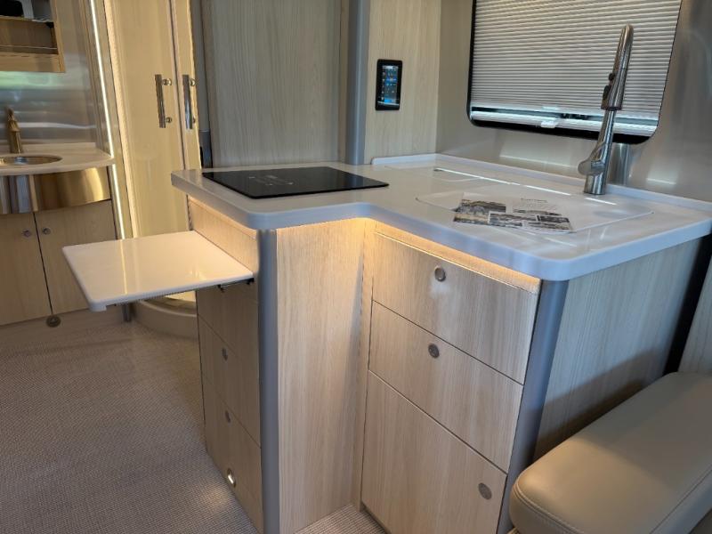Get ready to explore, unwind and "glamp" where ever you decide! This coach brings you everything you will need, plus much much more! The power slide offers a Murphy suite that retracts and fits seamlessly with the luxury automotive body style. With a touch of a button on the multiplex control panel, you will have more floor space to relax on the reclining sofa that includes two seatbelts or pull down the Murphy bed at night. There is more seating on the captain's chairs that swivel around to face the interior, and there are two tables that adjust to different heights for your needs. The kitchen provides a two-burner gas stove and large stainless steel Kohler sink and faucet, and there is a convection microwave, a slide-out pantry and a refrigerator with a freezer a few steps away.
