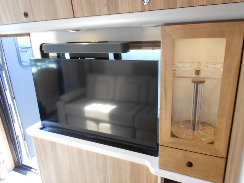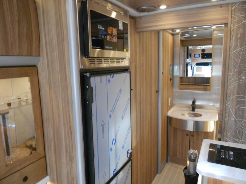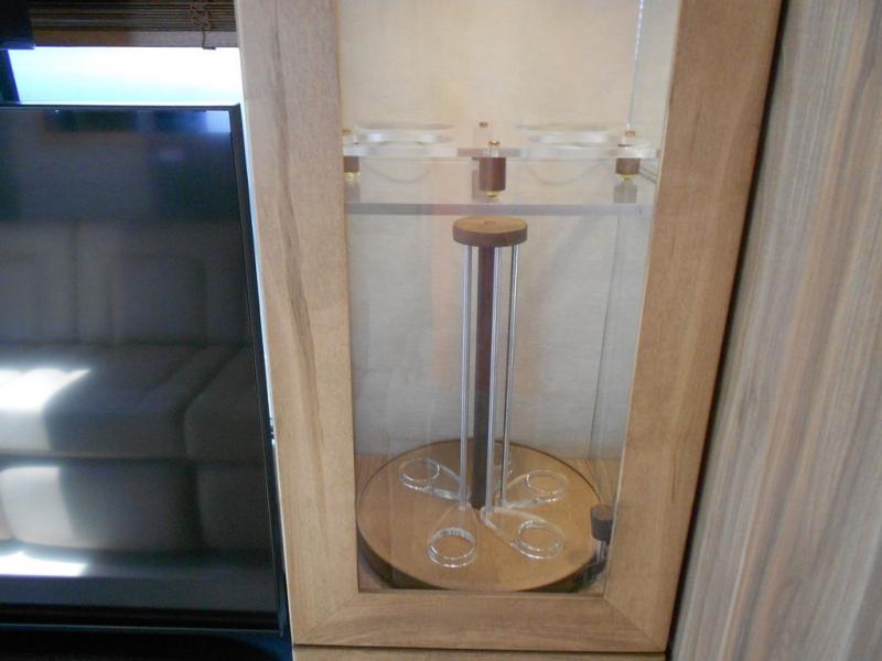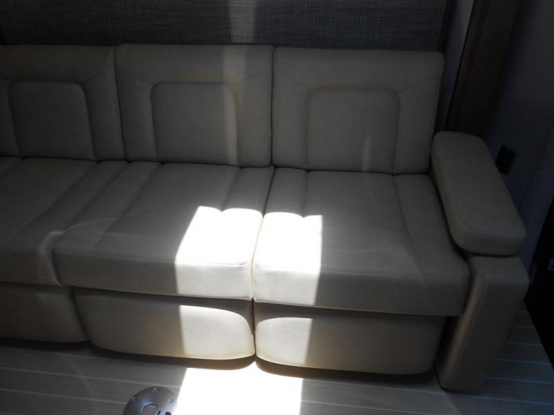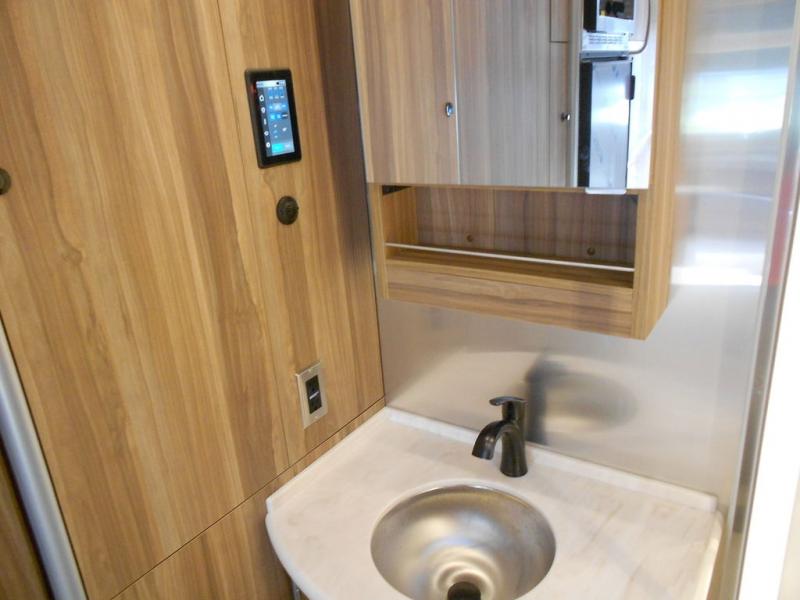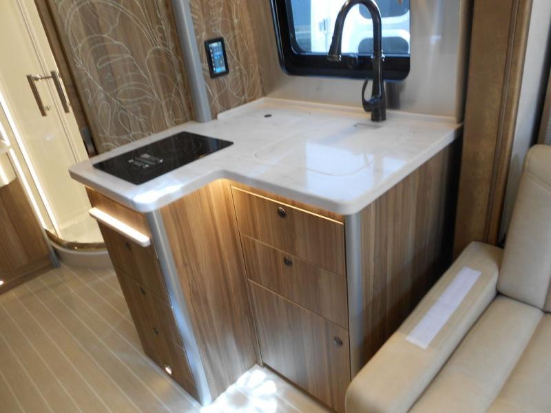 Get ready to explore, unwind and "glamp" where ever you decide! This coach brings you everything you will need, plus much much more! The power slide offers a Murphy suite that retracts and fits seamlessly with the luxury automotive body style. With a touch of a button on the multiplex control panel, you will have more floor space to relax on the reclining sofa that includes two seatbelts or pull down the Murphy bed at night. There is more seating on the captain's chairs that swivel around to face the interior, and there are two tables that adjust to different heights for your needs. The kitchen provides a two-burner gas stove and large stainless steel Kohler sink and faucet, and there is a convection microwave, a slide-out pantry and a refrigerator with a freezer a few steps away.
