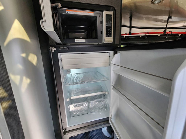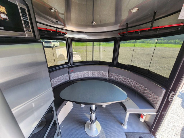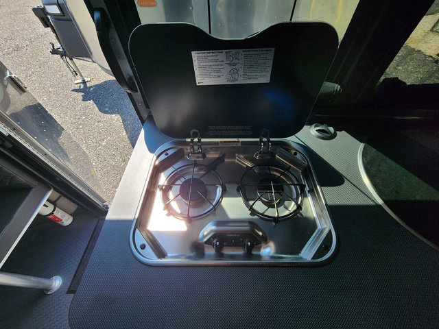 Adventure doesn't have to come in a large package, as you will soon find out when you take this Basecamp with your on your next trip! You can easily sleep four when using both the rear benches and the front U-shaped dinette. The benches provide split sleeping or a half-bed on one side and a full bed that spans the back of the trailer into an 82" x 78" area. There is storage under the cushions for the two removable tables that allow you to dine, work and relax. The wet bath comes complete with a shower, sink and toilet so you can rinse off from a day outdoors, and the galley kitchen gives the cook a place to make warm meals and store drinks and leftovers. This Basecamp also offers front panoramic windows, a steel entry step, a full-size spare tire, and a rear hatch allowing you to take your snowboards, skis, paddleboards and/or kayaks.