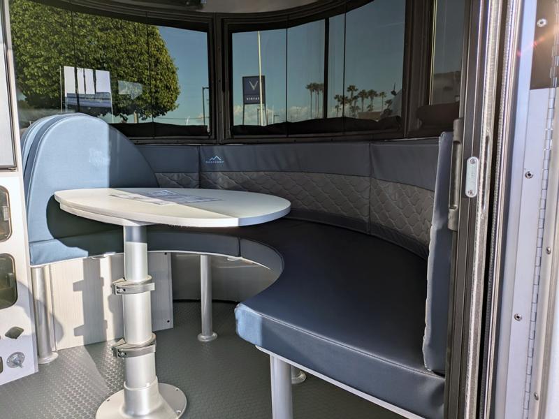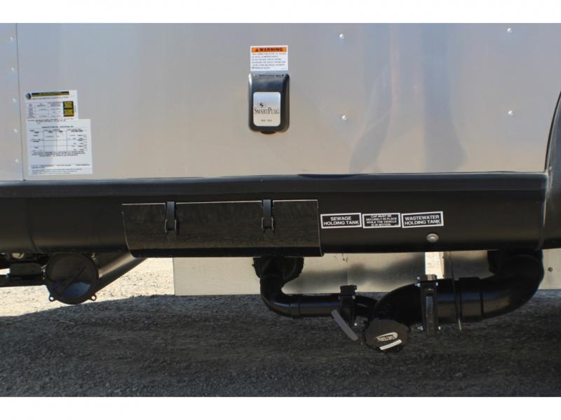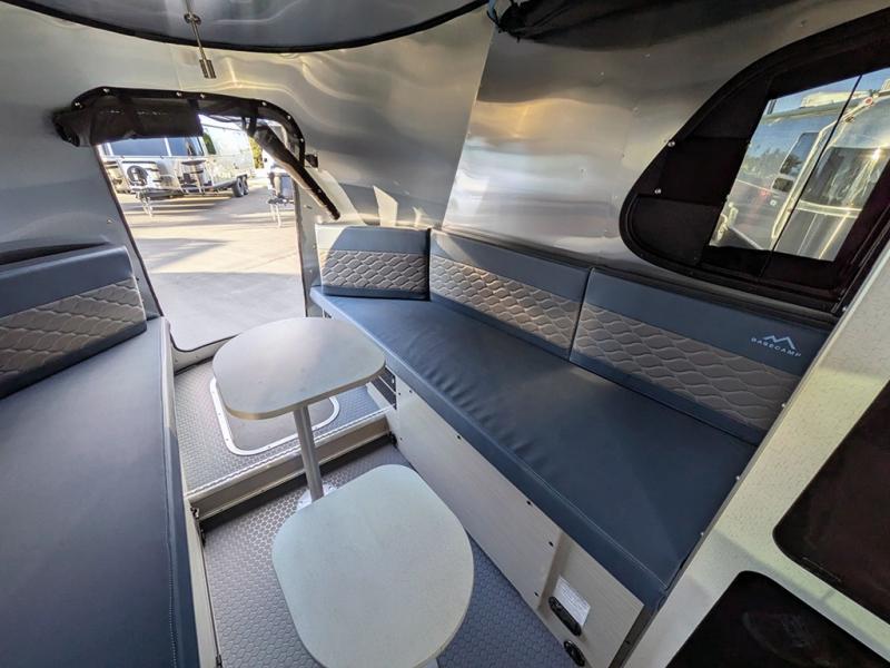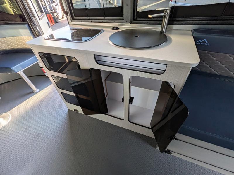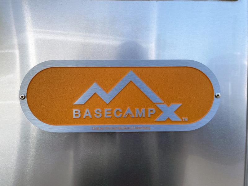 This travel trailer includes the Basecamp X Package that comes with stainless steel front stone guard protection, Goodyear off-road tires, and a 3" lift kit for added ground clearance. You can easily sleep everyone when using both the rear benches and the front U-shaped dinette. The benches provide split sleeping or a half-bed on one side and a full bed that spans the back of the trailer into an 82" x 78" area. There is storage under the cushions for the two removable tables that allow you to dine, work and relax with a place for your cellphones and such. The wet bath comes complete with a shower, sink and toilet so you can rinse off from a day outdoors, the galley kitchen gives the cook a place to make warm meals and store drinks and leftovers. This Basecamp also offers front panoramic windows, a steel entry step, a full-size spare tire, and a rear hatch allowing you to take your snowboards, skis, and paddle boards.