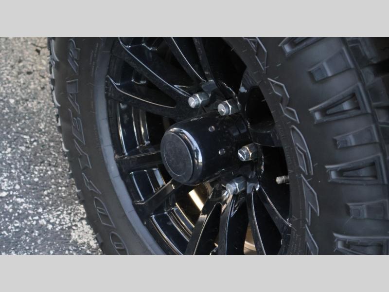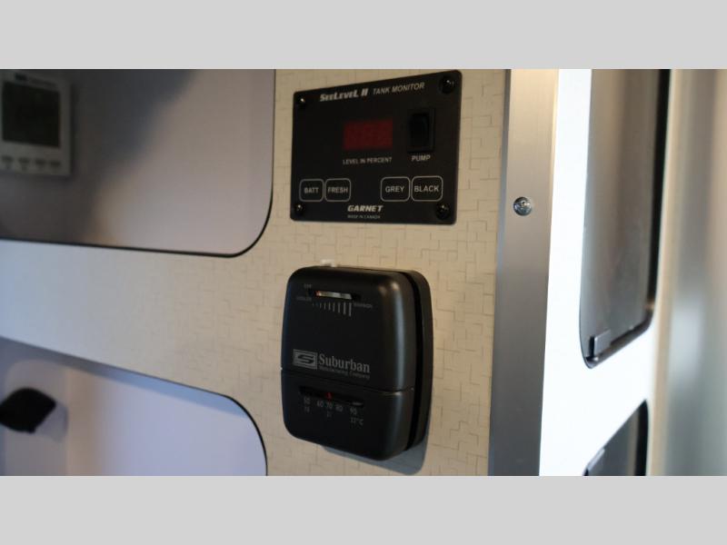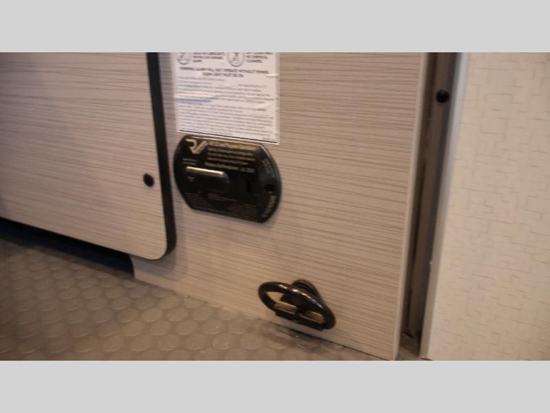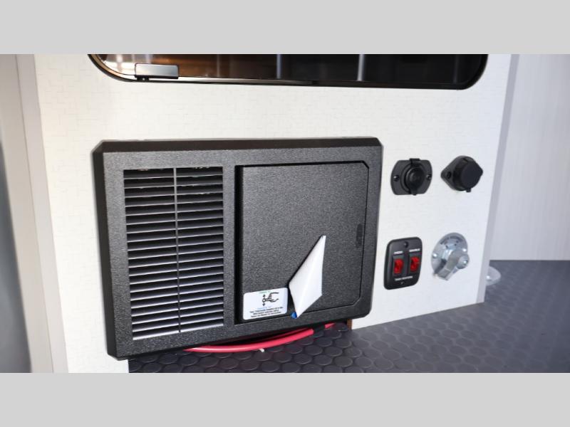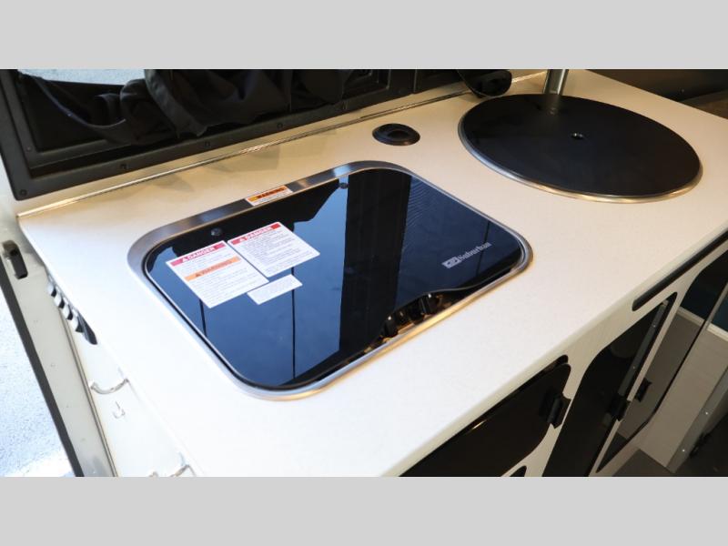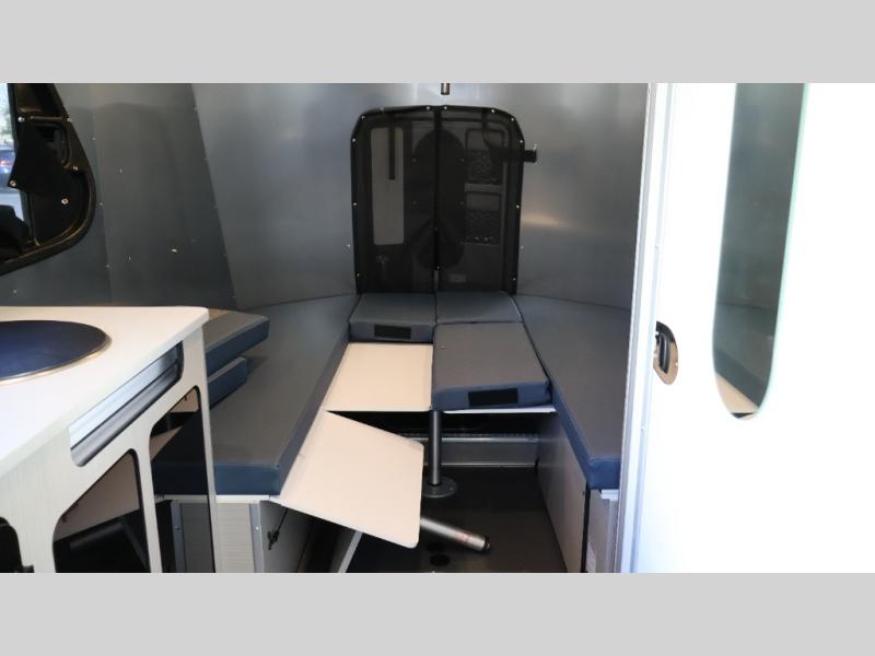 This travel trailer includes the Basecamp X Package that comes with stainless steel front stone guard protection, Goodyear off-road tires, and a 3" lift kit for added ground clearance. You can easily sleep everyone when using both the rear benches and the front U-shaped dinette. The benches provide split sleeping or a half-bed on one side and a full bed that spans the back of the trailer into an 82" x 78" area. There is storage under the cushions for the two removable tables that allow you to dine, work and relax with a place for your cellphones and such. The wet bath comes complete with a shower, sink and toilet so you can rinse off from a day outdoors, the galley kitchen gives the cook a place to make warm meals and store drinks and leftovers. This Basecamp also offers front panoramic windows, a steel entry step, a full-size spare tire, and a rear hatch allowing you to take your snowboards, skis, and paddle boards.