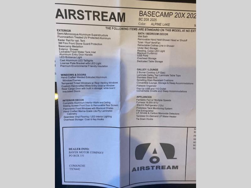 With any Basecamp travel trailer by Airstream, adventure knows no limits! The aggressive departure angle and large wheels are made specifically for handling uneven terrain, plus you can easily tow them with a variety of mid-size SUVs. The exterior includes a hand painted chassis, fluorocarbon treated UV protected aluminum, and a custom aluminum handcrafted entry door with window. You'll also find handcrafted welded extruded aluminum window frames, a torsion axle with shock absorbers, and Nev-R Adjust brakes. The interior offers Airstream Connected pre-wire, complete aluminum interior walls and ceiling, seating with Spradling stain resistant indoor/outdoor cushions and a laminate galley top, plus seamless vinyl flooring for durability and easy cleanup after all the adventures. A few features you will enjoy are the SmartPlug 30 Amp shore power, the aluminum Aircraft L-track storage system in the floor, and the optional fully enclosed tent, giving you the option to expand your outdoor living space!