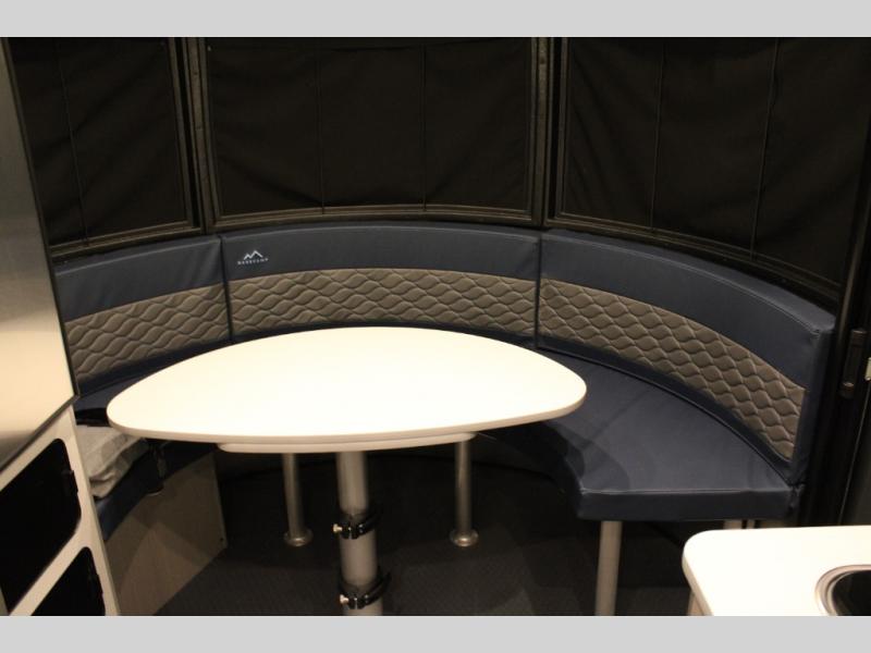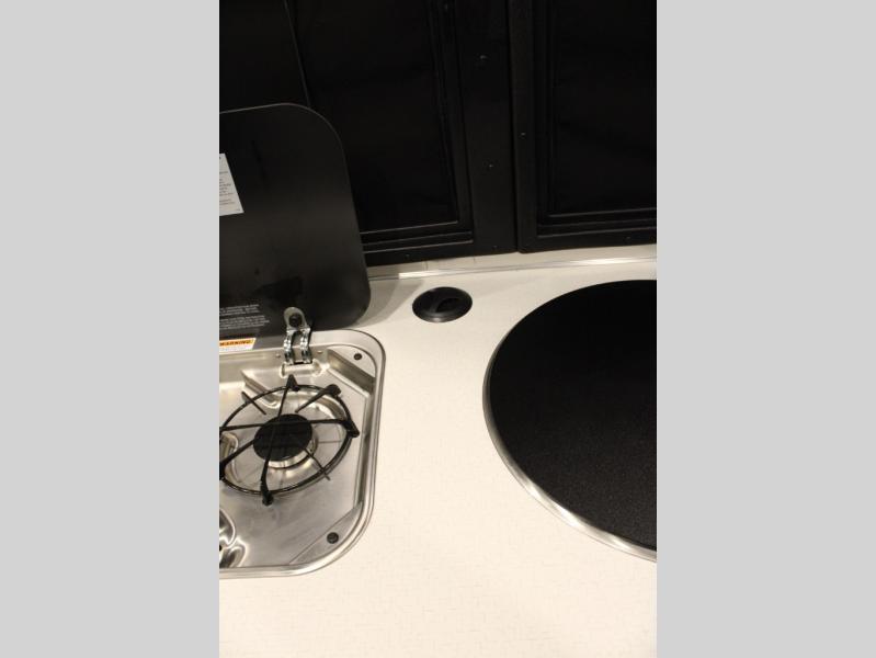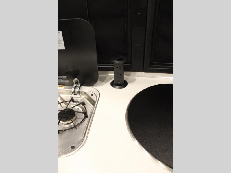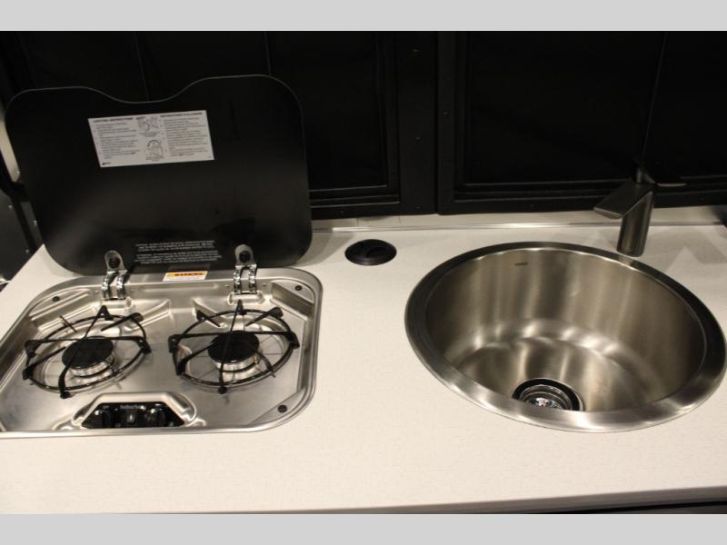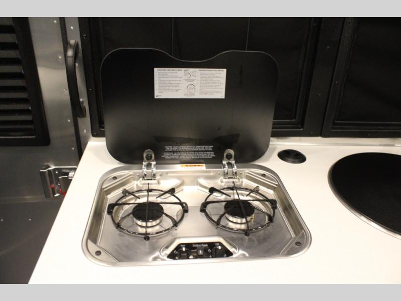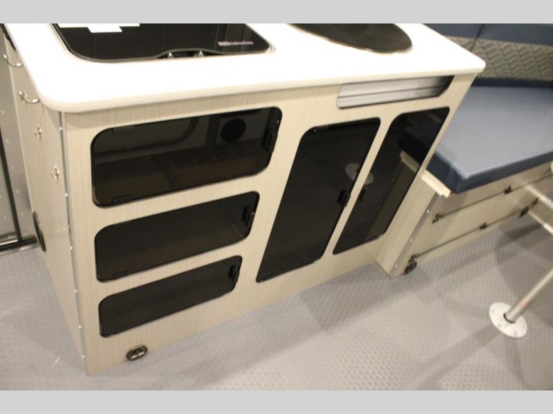 Adventure doesn't have to come in a large package, as you will soon find out when you take this Basecamp with your on your next trip! You can easily sleep four when using both the rear benches and the front U-shaped dinette. The benches provide split sleeping or a half-bed on one side and a full bed that spans the back of the trailer into an 82" x 78" area. There is storage under the cushions for the two removable tables that allow you to dine, work and relax. The wet bath comes complete with a shower, sink and toilet so you can rinse off from a day outdoors, and the galley kitchen gives the cook a place to make warm meals and store drinks and leftovers. This Basecamp also offers front panoramic windows, a steel entry step, a full-size spare tire, and a rear hatch allowing you to take your snowboards, skis, paddleboards and/or kayaks.