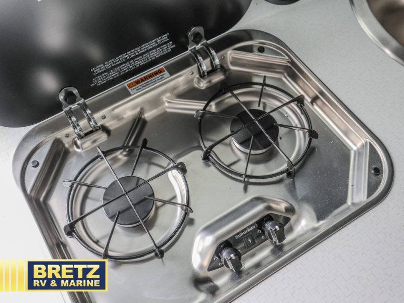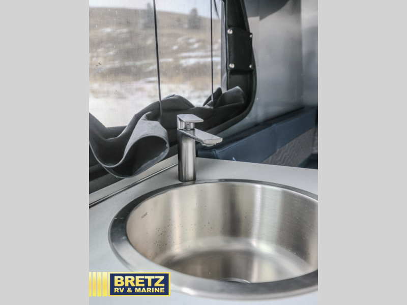 This travel trailer includes the Basecamp X Package that comes with stainless steel front stone guard protection, Goodyear off-road tires, and a 3" lift kit for added ground clearance. You can easily sleep everyone when using both the rear benches and the front U-shaped dinette. The benches provide split sleeping or a half-bed on one side and a full bed that spans the back of the trailer into an 82" x 78" area. There is storage under the cushions for the two removable tables that allow you to dine, work and relax with a place for your cellphones and such. The wet bath comes complete with a shower, sink and toilet so you can rinse off from a day outdoors, the galley kitchen gives the cook a place to make warm meals and store drinks and leftovers. This Basecamp also offers front panoramic windows, a steel entry step, a full-size spare tire, and a rear hatch allowing you to take your snowboards, skis, and paddle boards.