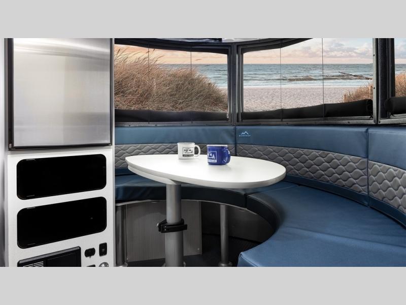 This travel trailer includes the Basecamp X Package that comes with stainless steel front stone guard protection, Goodyear off-road tires, and a 3" lift kit for added ground clearance. You can easily sleep everyone when using both the rear benches and the front U-shaped dinette. The benches provide split sleeping or a half-bed on one side and a full bed that spans the back of the trailer into an 82" x 78" area. There is storage under the cushions for the two removable tables that allow you to dine, work and relax with a place for your cellphones and such. The wet bath comes complete with a shower, sink and toilet so you can rinse off from a day outdoors, the galley kitchen gives the cook a place to make warm meals and store drinks and leftovers. This Basecamp also offers front panoramic windows, a steel entry step, a full-size spare tire, and a rear hatch allowing you to take your snowboards, skis, and paddle boards.