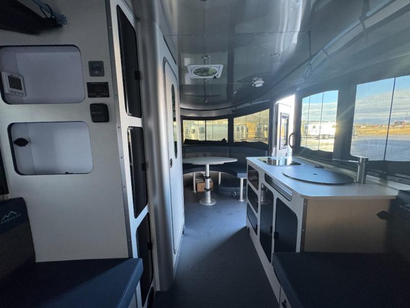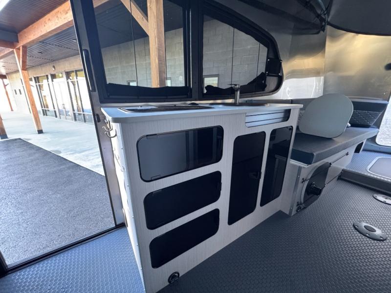 This travel trailer includes the Basecamp X Package that comes with stainless steel front stone guard protection, Goodyear off-road tires, and a 3" lift kit for added ground clearance. You can easily sleep everyone when using both the rear benches and the front U-shaped dinette. The benches provide split sleeping or a half-bed on one side and a full bed that spans the back of the trailer into an 82" x 78" area. There is storage under the cushions for the two removable tables that allow you to dine, work and relax with a place for your cellphones and such. The wet bath comes complete with a shower, sink and toilet so you can rinse off from a day outdoors, the galley kitchen gives the cook a place to make warm meals and store drinks and leftovers. This Basecamp also offers front panoramic windows, a steel entry step, a full-size spare tire, and a rear hatch allowing you to take your snowboards, skis, and paddle boards.