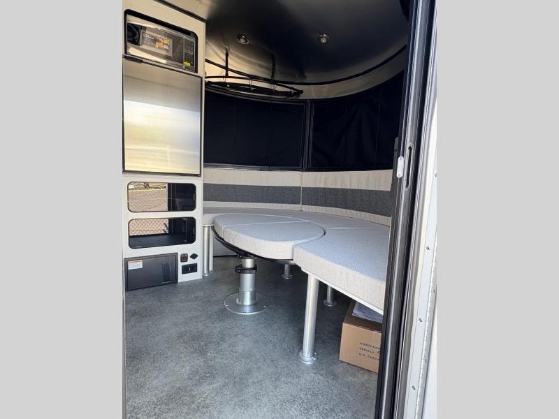 Chart a new map with this travel trailer in tow! Once you arrive at your destination, you can unload your gear, then start lunch on the single burner induction cooktop. An all-electric refrigerator lets you store cold items, and an optional microwave can be added for added convenience. You'll find bench seating in the back with removable tables that can be adjusted to different heights and directions. When it's time for bed, the benches can be converted to a half bed on one side, a full bed that spans the back of the unit, or a split sleeping area. A rear door gives you quick and easy access to your built-in floor storage with a drain, doubling it as a cooler!