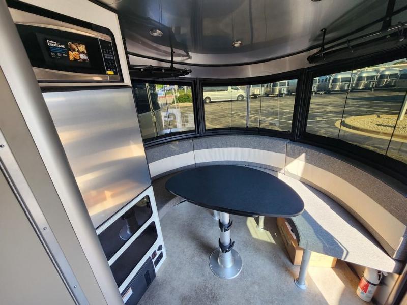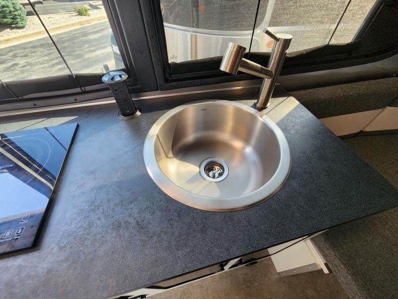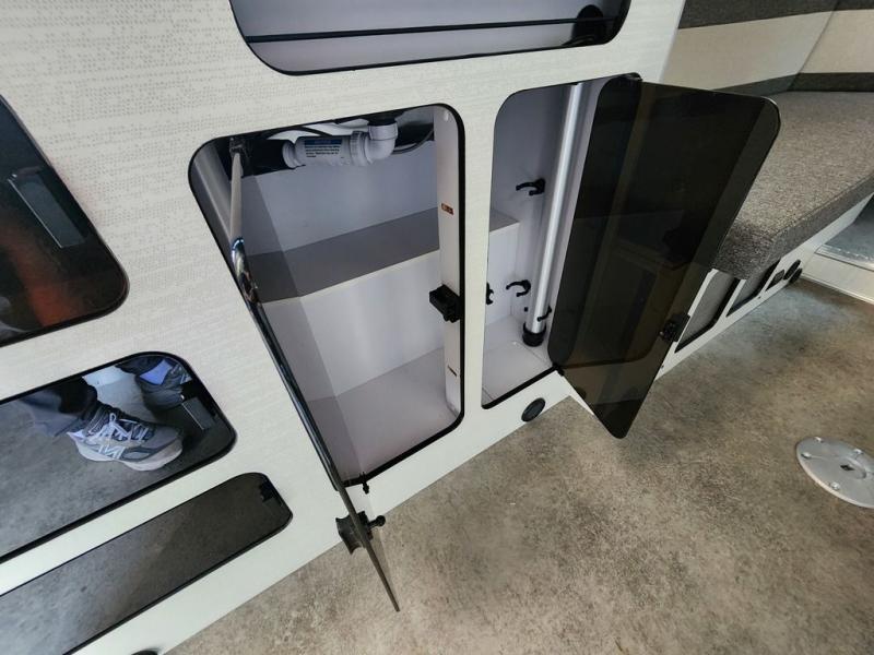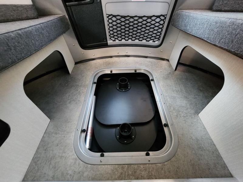 Chart a new map with this travel trailer in tow! Once you arrive at your destination, you can unload your gear, then start lunch on the single burner induction cooktop. An all-electric refrigerator lets you store cold items, and an optional microwave can be added for added convenience. You'll find bench seating in the back with removable tables that can be adjusted to different heights and directions. When it's time for bed, the benches can be converted to a half bed on one side, a full bed that spans the back of the unit, or a split sleeping area. A rear door gives you quick and easy access to your built-in floor storage with a drain, doubling it as a cooler!