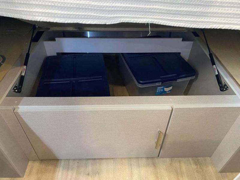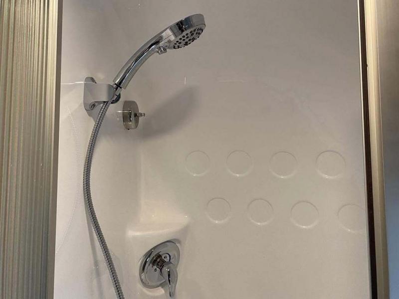 The pillowtop memory foam mattress fits perfectly into the curves of this Caravel travel trailer which offers you the perfect place to relax! There are panoramic windows surrounding this area with blackout curtains that you can close when you need some privacy, and the LED reading lights will provide some illumination while you are lounging. You can also lift up the bed to reveal the under-bed storage. The U-shaped dinette is another feature that provides two uses. It can be a great dining place for four people, or it can serve as a bed for two. The bathroom is located in the back for a little more privacy, and it offers a large vanity, a retractable clothesline in the shower, and a removable handheld shower head.