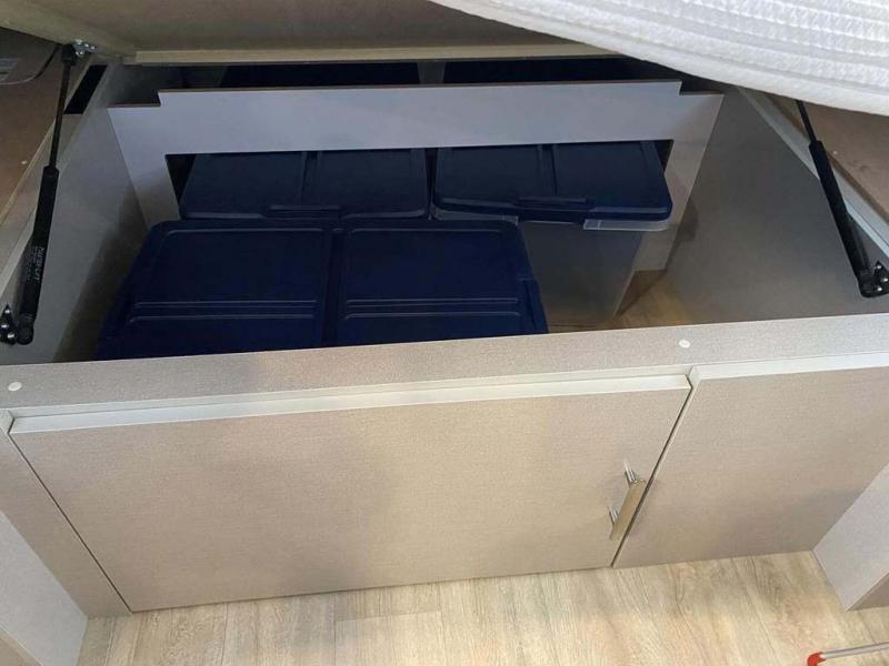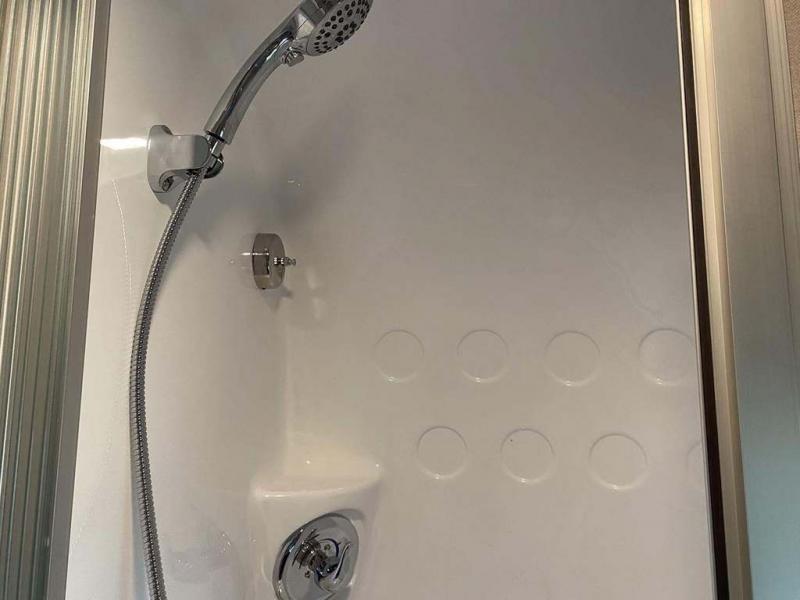 The pillowtop memory foam mattress fits perfectly into the curves of this Caravel travel trailer which offers you the perfect place to relax! There are panoramic windows surrounding this area with blackout curtains that you can close when you need some privacy, and the LED reading lights will provide some illumination while you are lounging. You can also lift up the bed to reveal the under-bed storage. The U-shaped dinette is another feature that provides two uses. It can be a great dining place for four people, or it can serve as a bed for two. The bathroom is located in the back for a little more privacy, and it offers a large vanity, a retractable clothesline in the shower, and a removable handheld shower head.