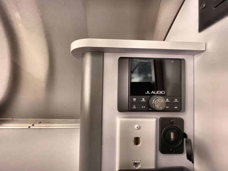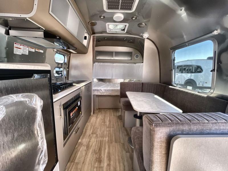 The U-shaped dinette is versatile, serving as a comfortable dining space for four or converting into a bed for two. The modern galley kitchen features a three-burner cooktop, stainless steel finishes, and thoughtful storage for meal prep and cookware. Entertainment is effortless with the JL Audio stereo system, Bluetooth connectivity, and four speakers with subwoofer, making this trailer ideal for both relaxation and social gatherings. The manual Zip Dee patio awning extends outdoor living space, while optional window awnings and a solar package let you stay cool, private, and powered while off the grid. Durable stainless steel front stone guard protection and a polished rear bumper ensure your Airstream travels safely wherever adventure calls.