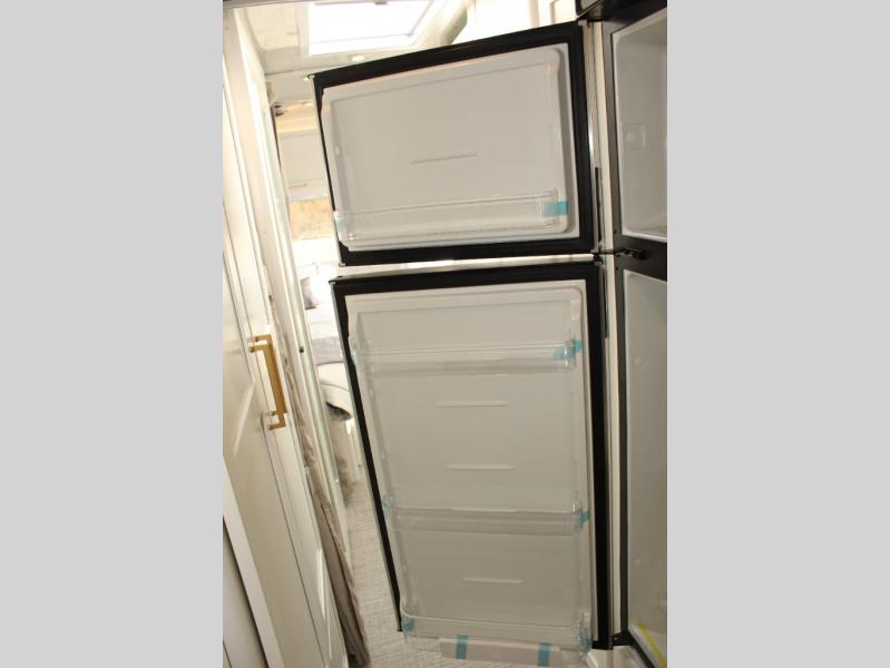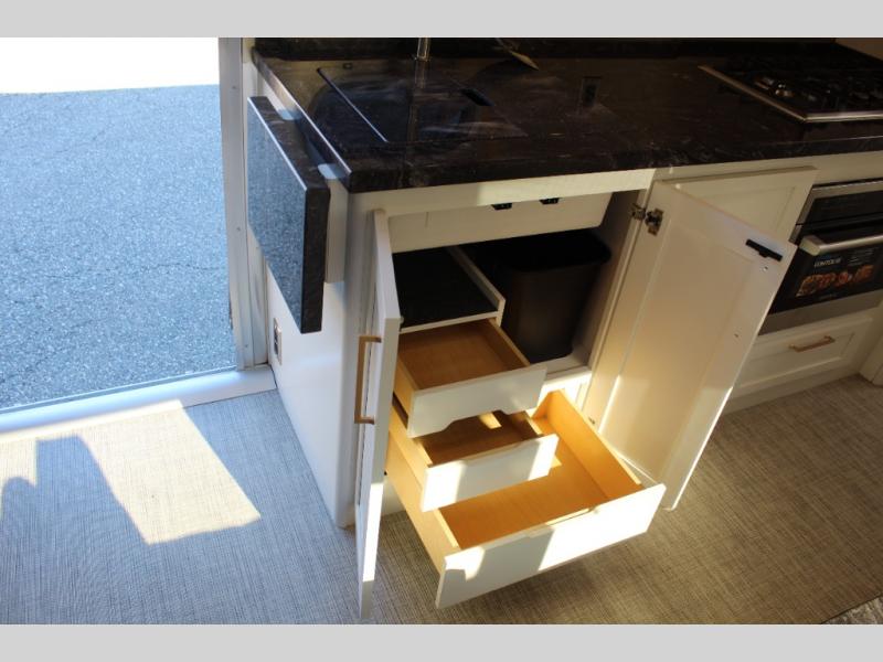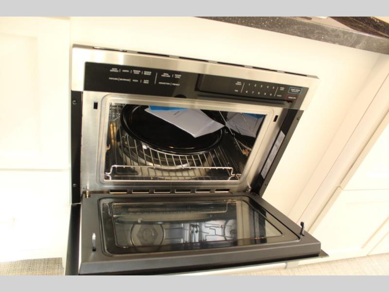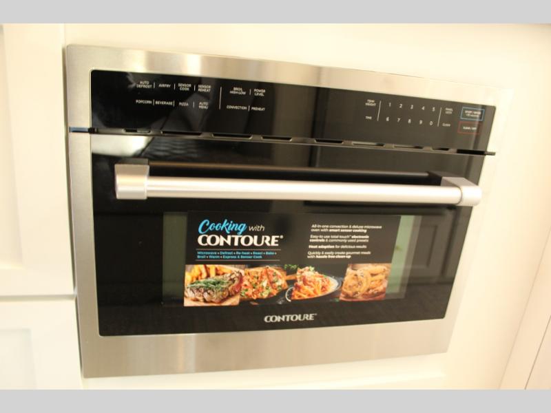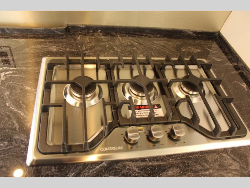 A stainless-steel gas stove, convection microwave, solid-surface countertops, deep sink, and full-size refrigerator make meal prep effortless on the road.