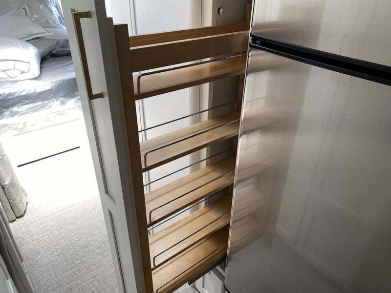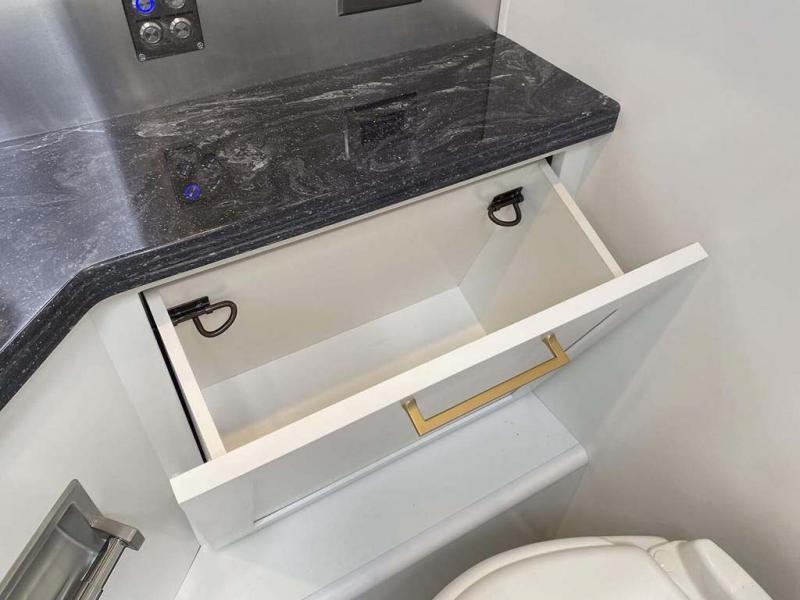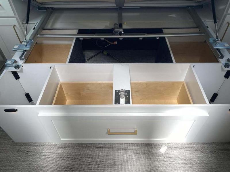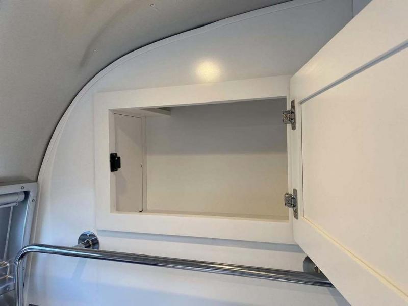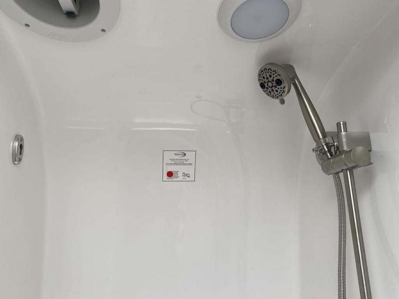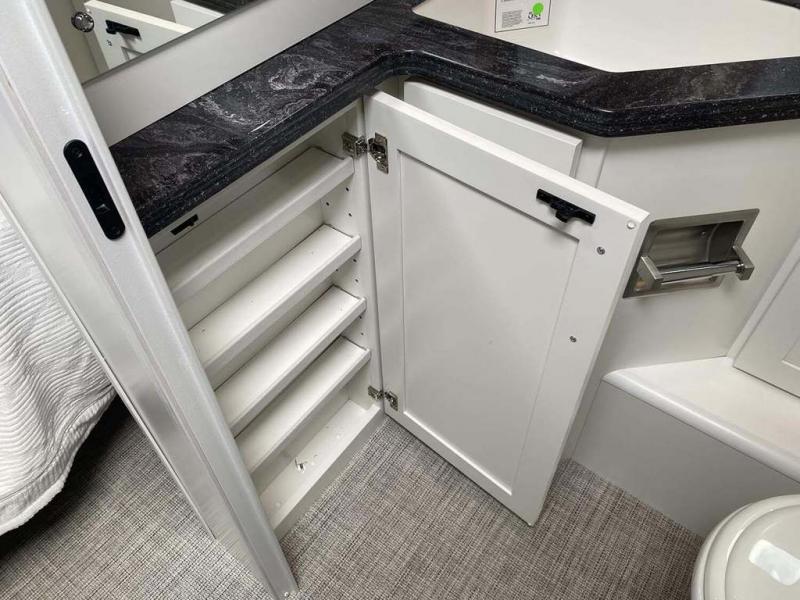 You'll have everything you need for a luxurious stay in this cozy travel trailer. The rear bedroom includes a power queen bed so you can adjust the head if you like to read at night, plus there are nightstands on either side of the bed for your phone, glasses, and a cup of water. You might also like to choose the optional twin beds in place of the queen bed, depending on your needs. The private toilet and vanity features plenty of counter space for your necessities, and the independent shower is just across the hall with its own door for privacy. Your crew will love to relax on the front powered lounge that has a perfect view of the 32" Smart TV with Bluetooth and this space can be converted to sleeping space for your guests, along with the powered dinette.