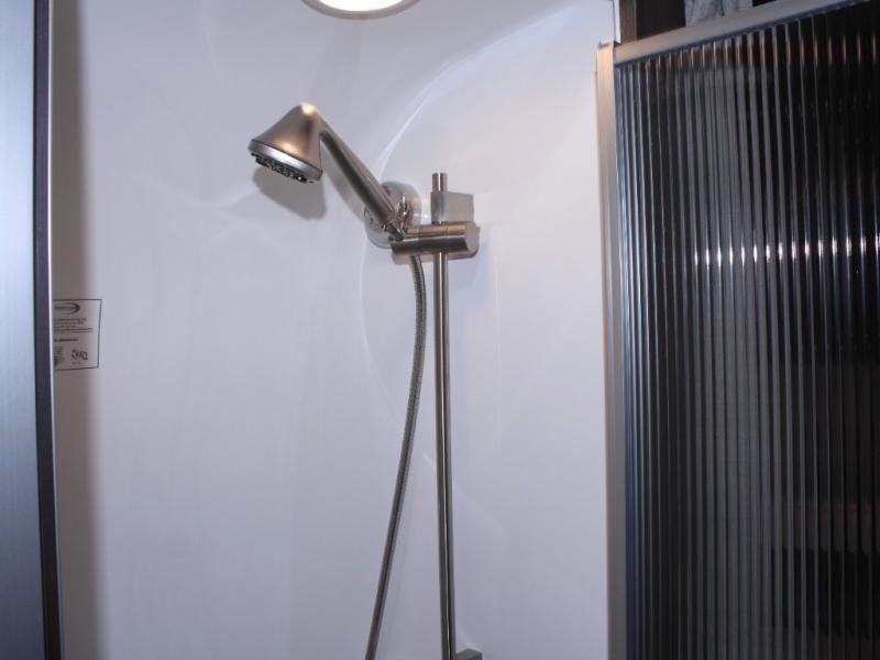 The spa-inspired bathroom features a removable handheld aerating shower head, heated towel bar, and premium fixtures for a truly rejuvenating experience.