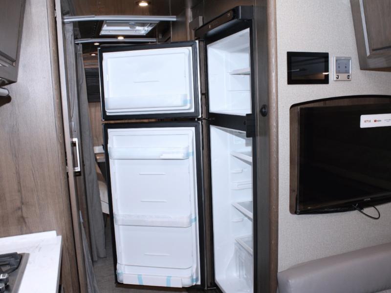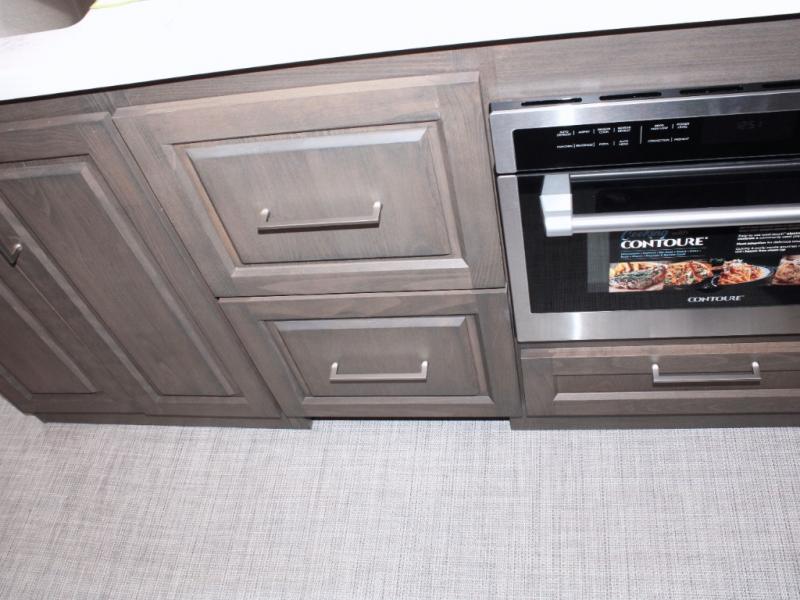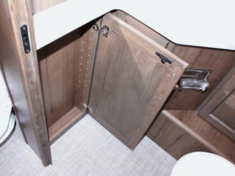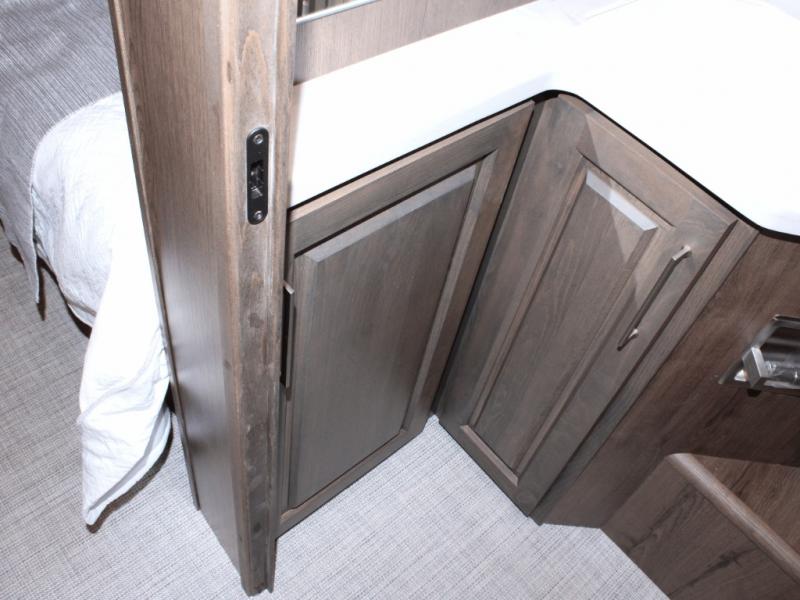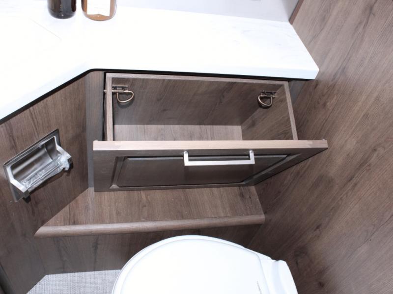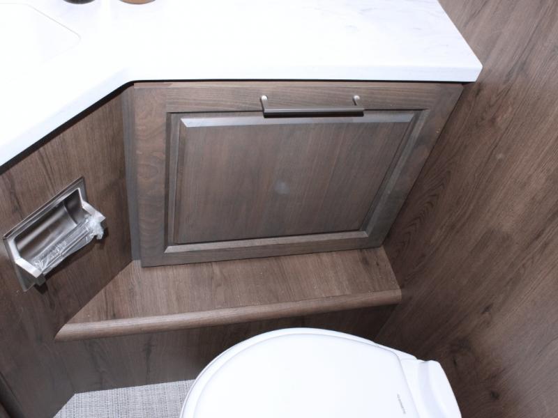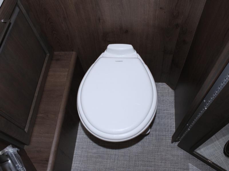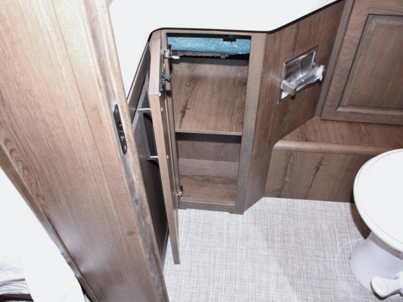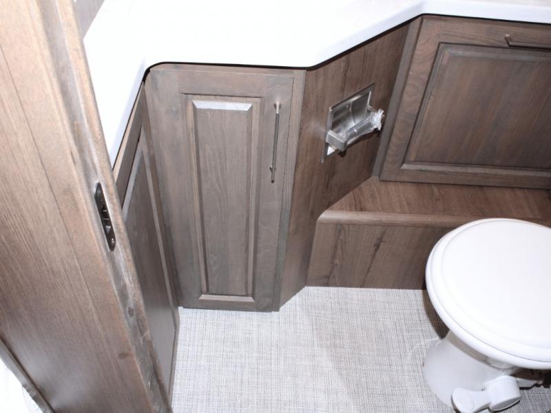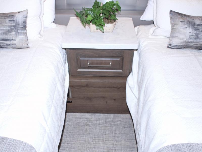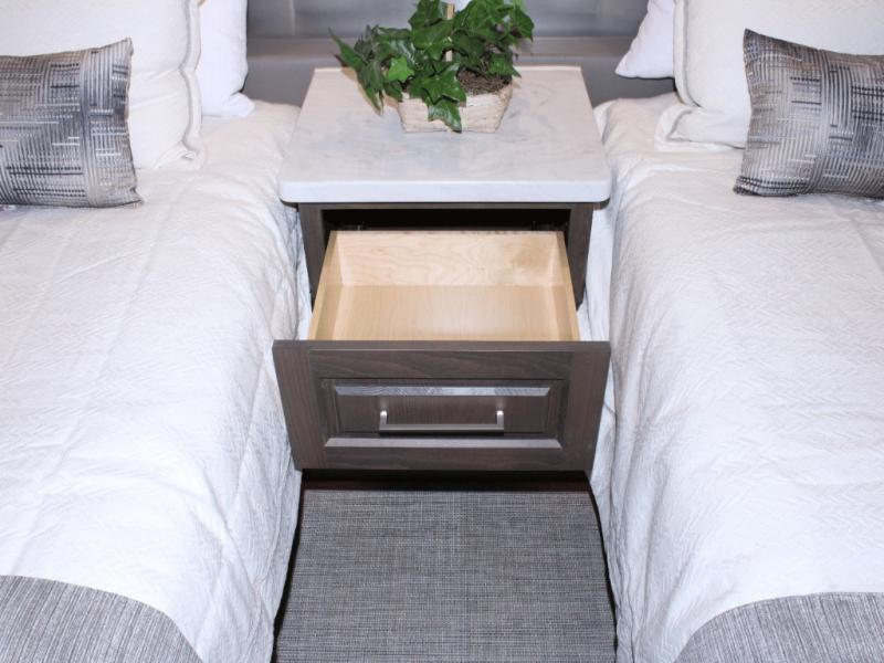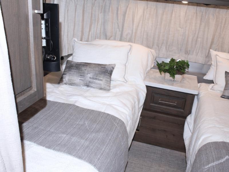 At the heart of this beautifully designed coach is the rear twin bed layout, giving you and your partner the flexibility and comfort of individual sleeping spaces. A center nightstand provides handy storage for essentials like your phone, glasses, or nighttime reads. Plus, your guests can comfortably sleep on the powered lounge or convertible dinette, making room for everyone onboard.