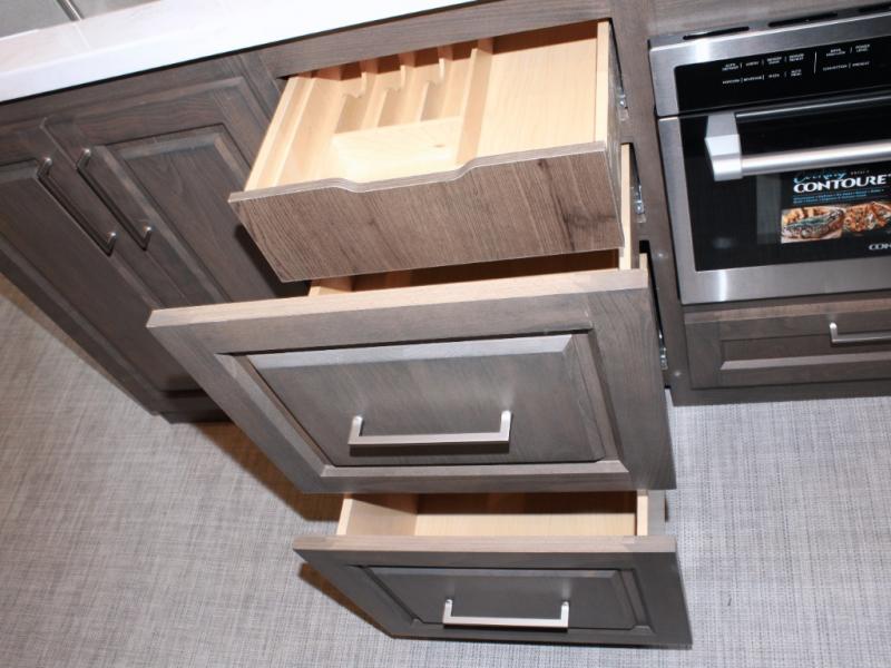Hardwood cabinetry and solid surface countertops for a refined, residential feel