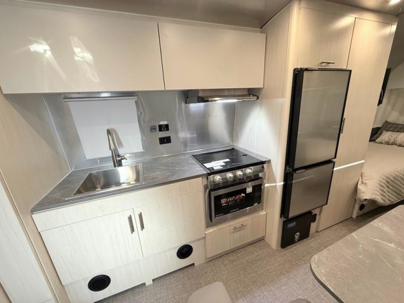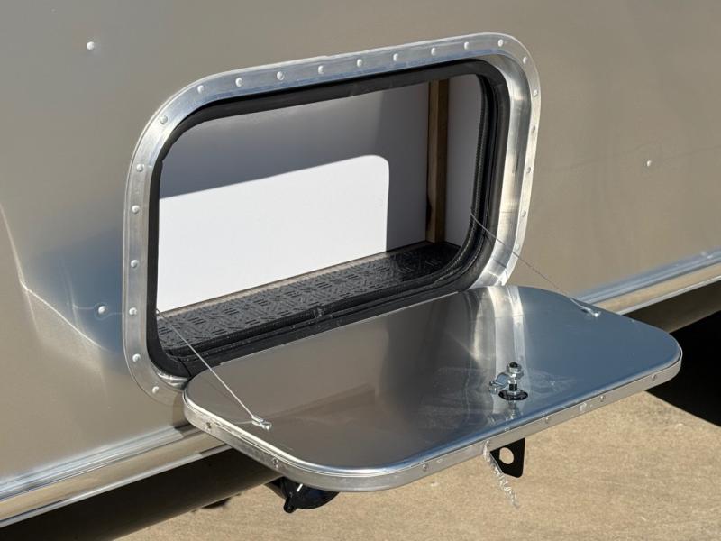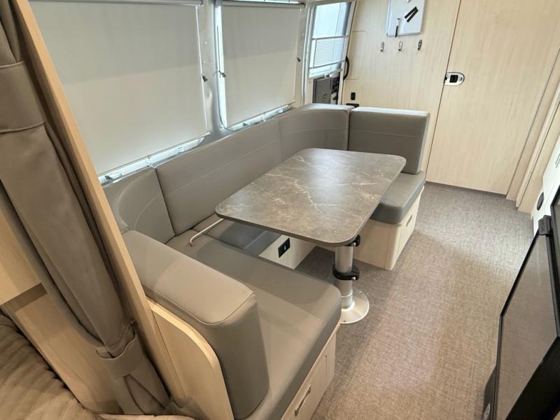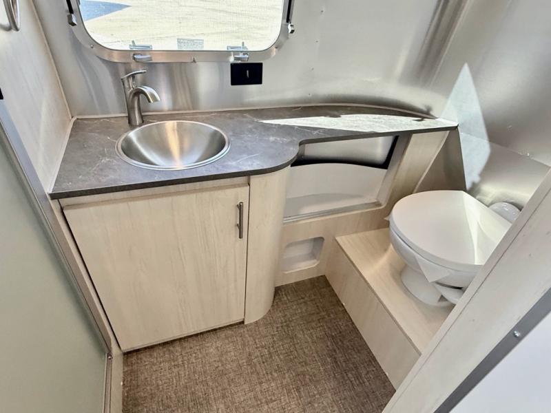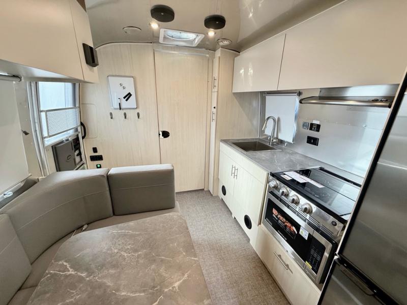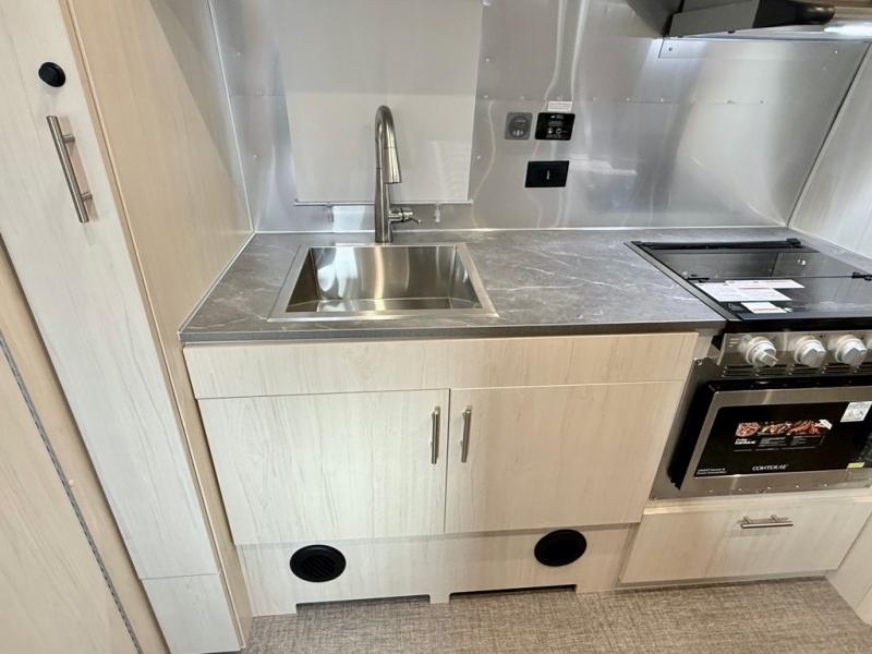 With each Flying Cloud travel trailer by Airstream, there are two axles, and each is built for ease of towing, plus there is a rear-view camera to make reversing and parking easier, and stainless steel front stone guards to protect the lower segments from road debris. The iconic Airstream design is created outside and inside by the semi-monocoque aluminum superstructure, the temperature reducing one-piece white aluminum roof, the panoramic front windows, and the stylish aluminum wheels. The interior will have you feeling right at home with handcrafted cabinetry, plenty of storage and counter space, sleek roller blinds and blackout curtains, plus residential style faucets!