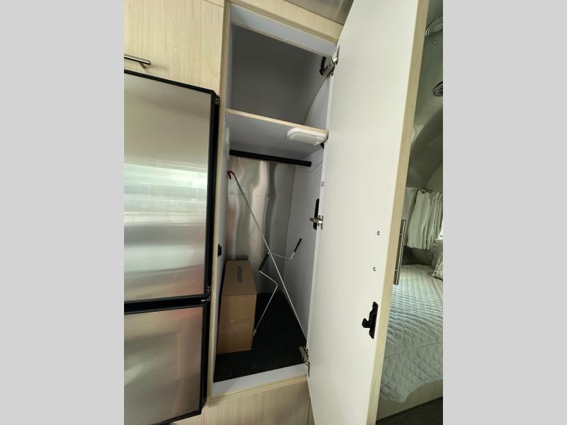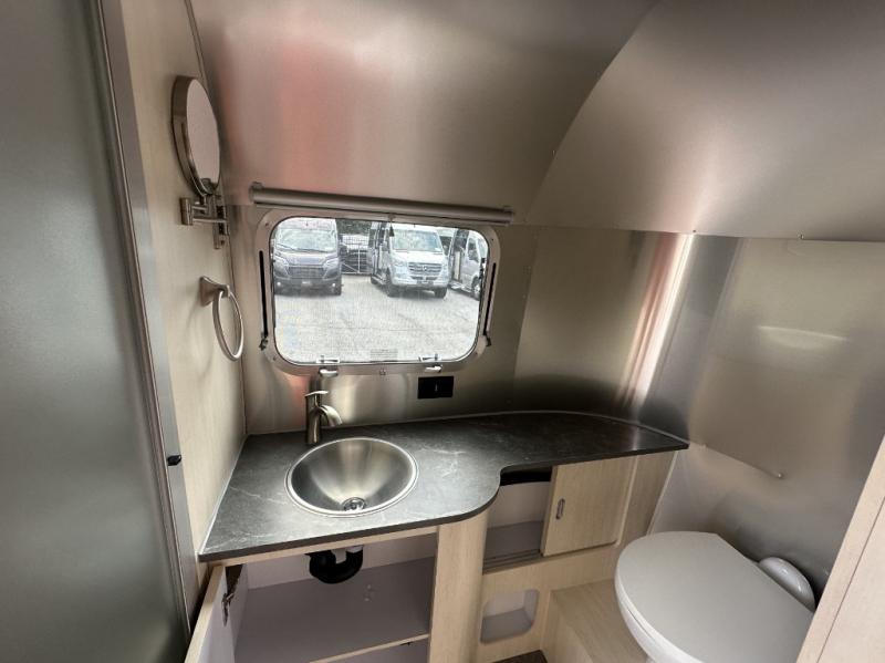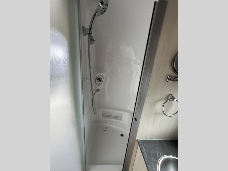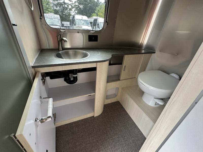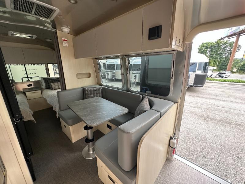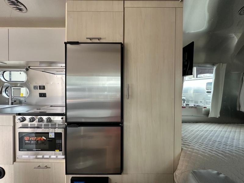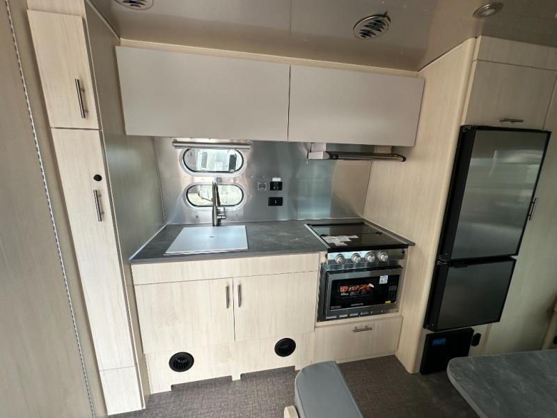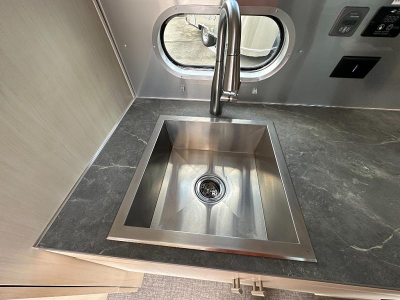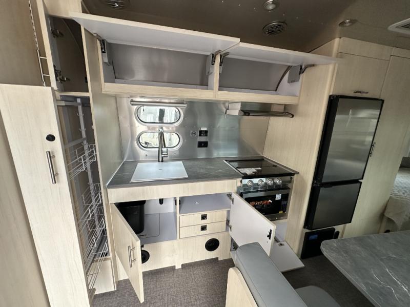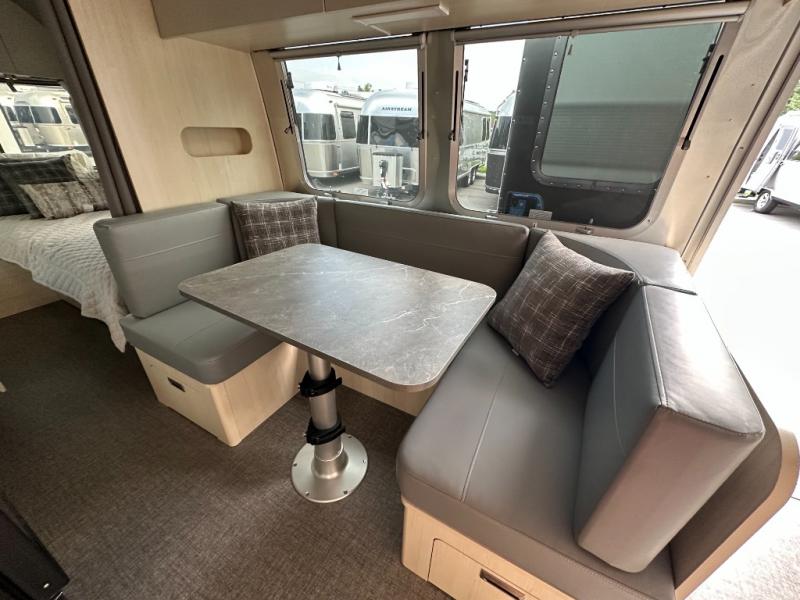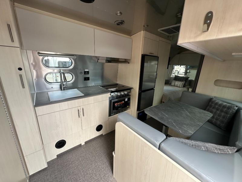 With each Flying Cloud travel trailer by Airstream, there are two axles, and each is built for ease of towing, plus there is a rear-view camera to make reversing and parking easier, and stainless steel front stone guards to protect the lower segments from road debris. The iconic Airstream design is created outside and inside by the semi-monocoque aluminum superstructure, the temperature reducing one-piece white aluminum roof, the panoramic front windows, and the stylish aluminum wheels. The interior will have you feeling right at home with handcrafted cabinetry, plenty of storage and counter space, sleek roller blinds and blackout curtains, plus residential style faucets!