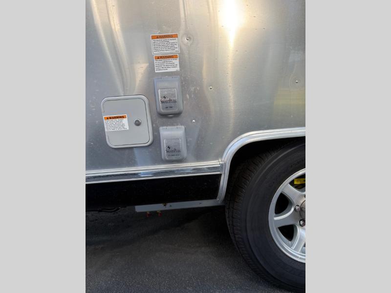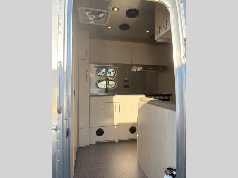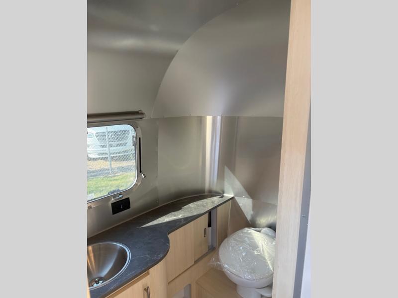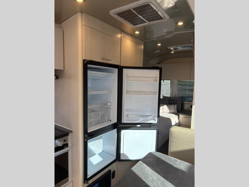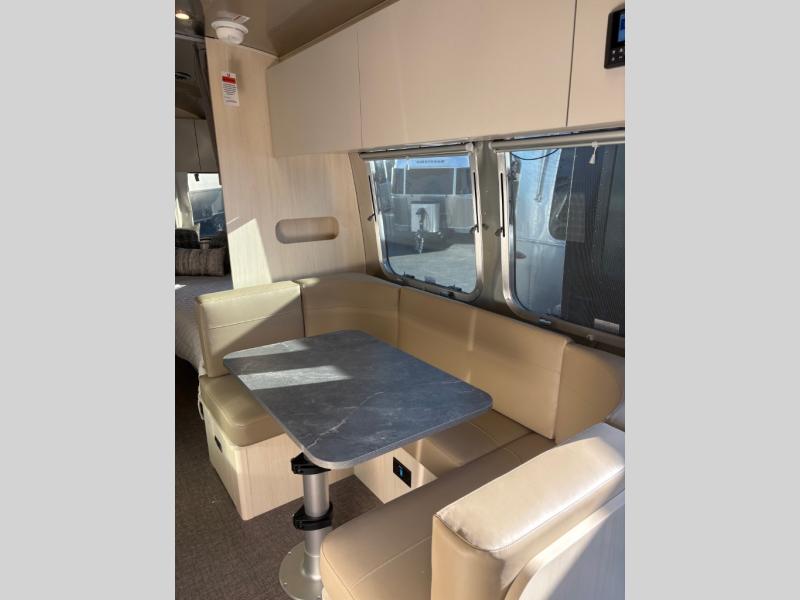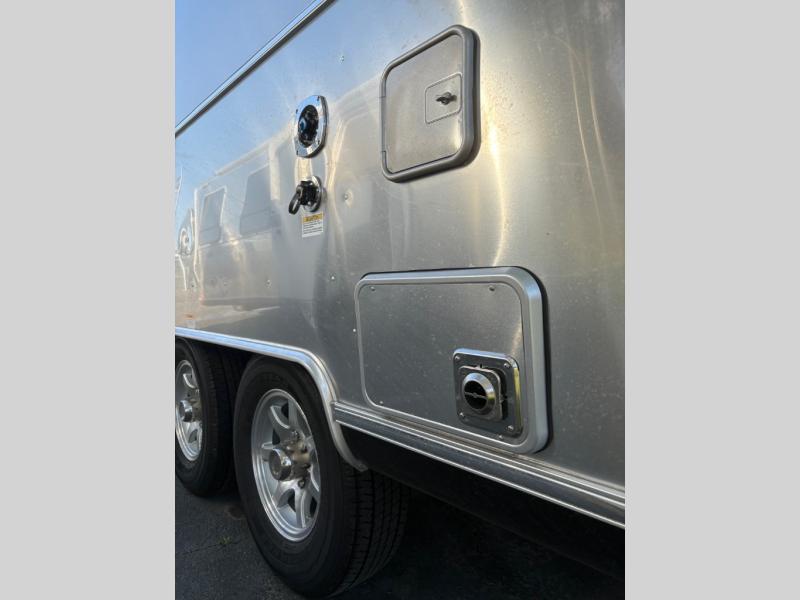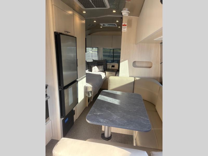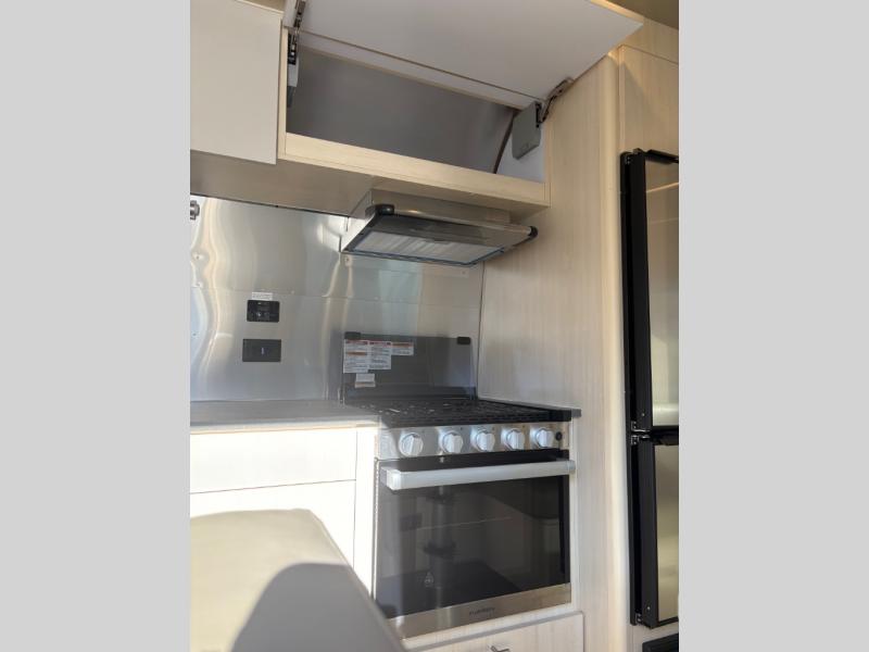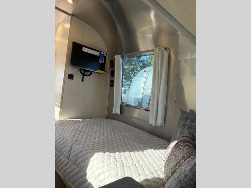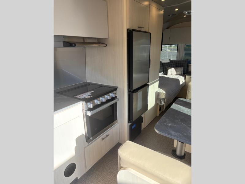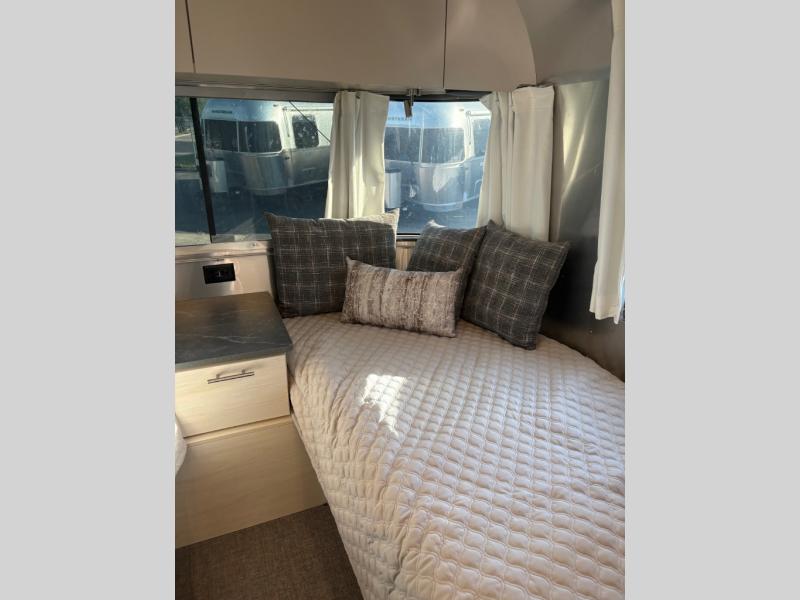 With each Flying Cloud travel trailer by Airstream, there are two axles, and each is built for ease of towing, plus there is a rear-view camera to make reversing and parking easier, and stainless steel front stone guards to protect the lower segments from road debris. The iconic Airstream design is created outside and inside by the semi-monocoque aluminum superstructure, the temperature reducing one-piece white aluminum roof, the panoramic front windows, and the stylish aluminum wheels. The interior will have you feeling right at home with handcrafted cabinetry, plenty of storage and counter space, sleek roller blinds and blackout curtains, plus residential style faucets!