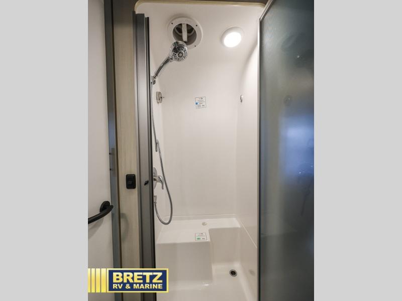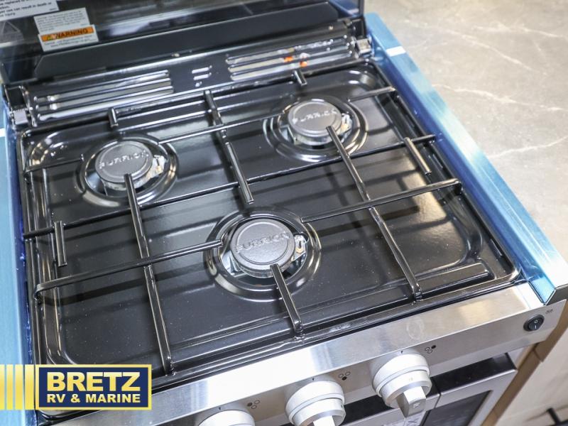 When you enjoy the finer things when traveling, this trailer will provide that for you plus lots of natural lighting and plenty of conveniences. The convertible rear dinette offers a place to dine and socialize for four, and there is a lounging area along the side with a TV on the wall. The table acts as a sturdy base below the cushions when you need some sleeping space. The front bedroom offers more panoramic windows and a comfortable queen bed or optional twin beds with a view each morning and night. You will find storage for your clothing, and a split bathroom with a private toilet and sink on one side and a shower that stands independently across the hall. And the kitchen offers everything you need to make meals including extra counter space and a refrigerator for leftovers. And there is a rear hatch option for this trailer you might want to add to let fresh air in!