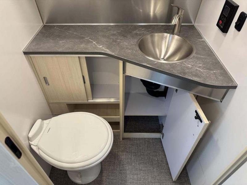When you enjoy the finer things when traveling, this trailer will provide that for you plus lots of natural lighting and plenty of conveniences. The convertible rear dinette offers a place to dine and socialize for four, and there is a lounging area along the side with a TV on the wall. The table acts as a sturdy base below the cushions when you need some sleeping space. The front bedroom offers more panoramic windows and a comfortable queen bed or optional twin beds with a view each morning and night. You will find storage for your clothing, and a split bathroom with a private toilet and sink on one side and a shower that stands independently across the hall. And the kitchen offers everything you need to make meals including extra counter space and a refrigerator for leftovers. And there is a rear hatch option for this trailer you might want to add to let fresh air in! The Midnight Flamingo optional upgrade is also available on this model for even more striking style and functional upgrades!