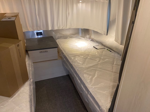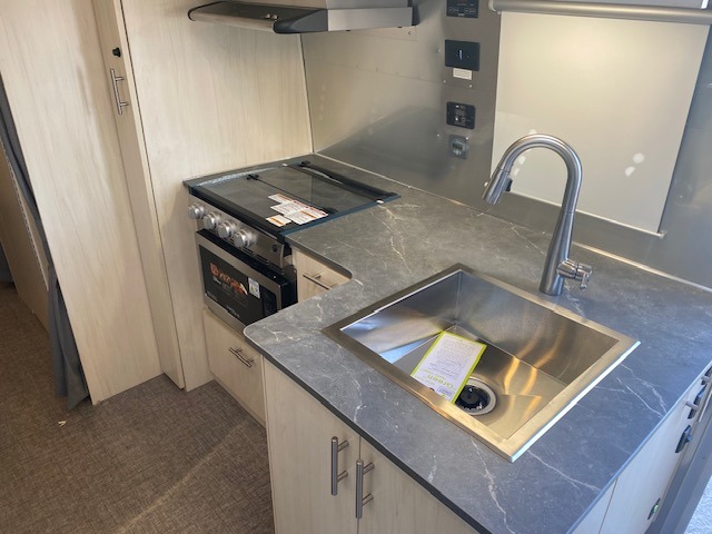 With each Flying Cloud travel trailer by Airstream, there are two axles, and each is built for ease of towing, plus there is a rear-view camera to make reversing and parking easier, and stainless steel front stone guards to protect the lower segments from road debris. The iconic Airstream design is created outside and inside by the semi-monocoque aluminum superstructure, the temperature reducing one-piece white aluminum roof, the panoramic front windows, and the stylish aluminum wheels. The interior will have you feeling right at home with handcrafted cabinetry, plenty of storage and counter space, sleek roller blinds and blackout curtains, plus residential style faucets!
