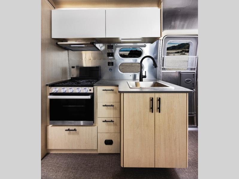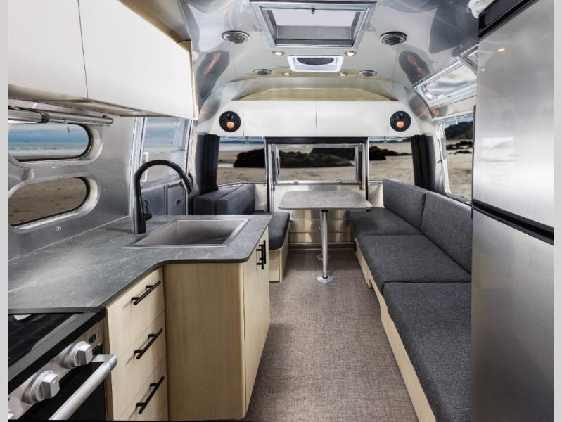 With each Flying Cloud travel trailer by Airstream, there are two axles, and each is built for ease of towing, plus there is a rear-view camera to make reversing and parking easier, and stainless steel front stone guards to protect the lower segments from road debris. The iconic Airstream design is created outside and inside by the semi-monocoque aluminum superstructure, the temperature reducing one-piece white aluminum roof, the panoramic front windows, and the stylish aluminum wheels. The interior will have you feeling right at home with handcrafted cabinetry, plenty of storage and counter space, sleek roller blinds and blackout curtains, plus residential style faucets!