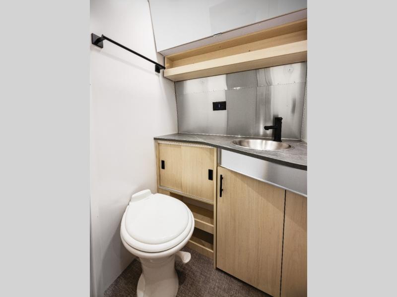 When you enjoy the finer things when traveling, this trailer will provide that for you plus lots of natural lighting and plenty of conveniences. The convertible rear dinette offers a place to dine and socialize for four, and there is a lounging area along the side with a TV on the wall. The table acts as a sturdy base below the cushions when you need some sleeping space. The front bedroom offers more panoramic windows and comfortable twin beds with a view each morning and night. There is floor space in the center and a nightstand for extra storage and charging space. You will find storage for your clothing, and a split bathroom with a half bath on one side and a shower that stands independently across the hall. And the kitchen offers everything you need to make meals including extra counter space and a refrigerator for leftovers. And there is a rear hatch option for this trailer. The Midnight Flamingo optional upgrade is also available on this model for even more striking style and functional upgrades!