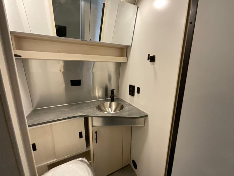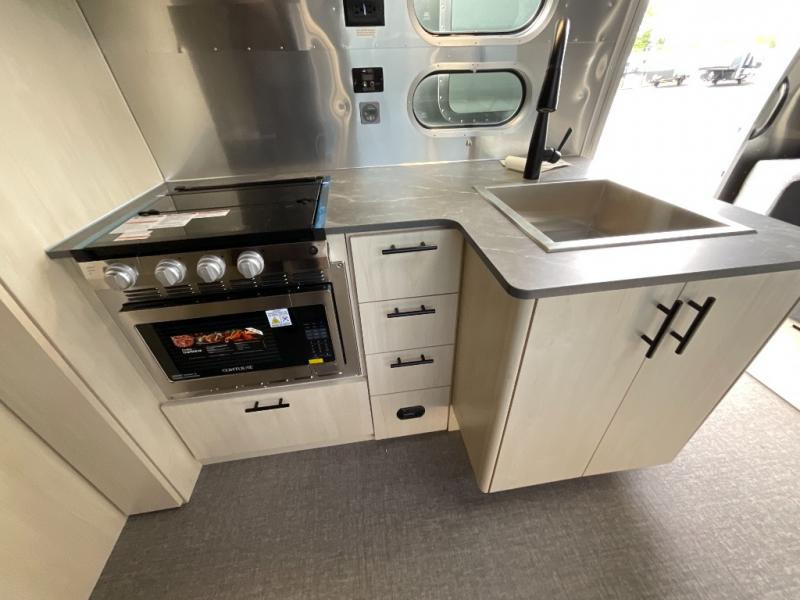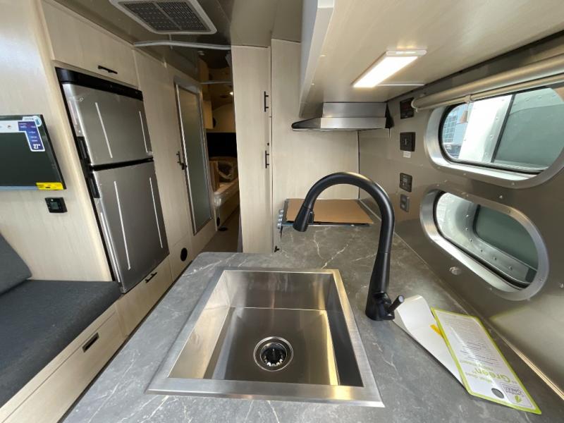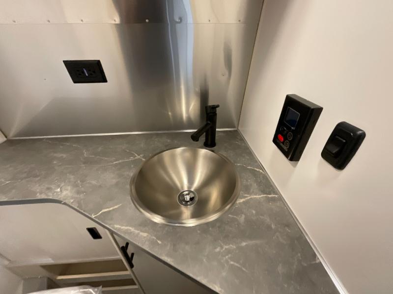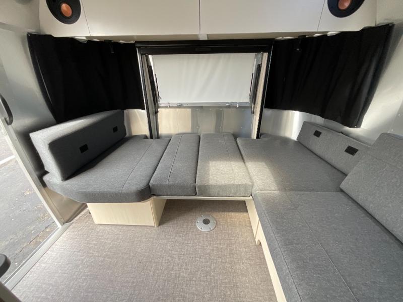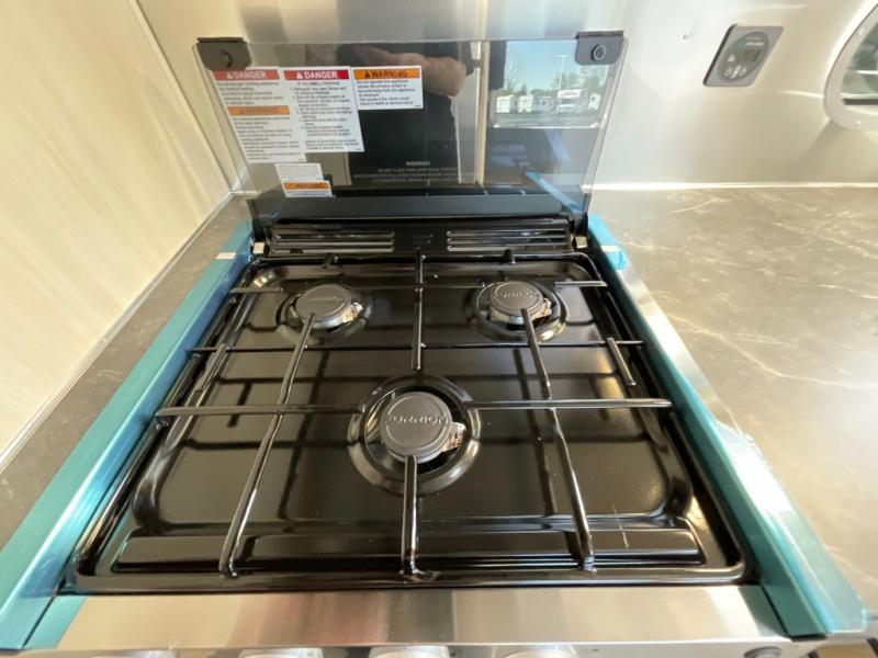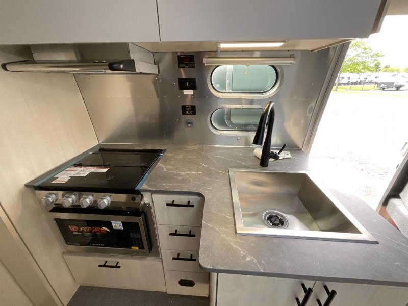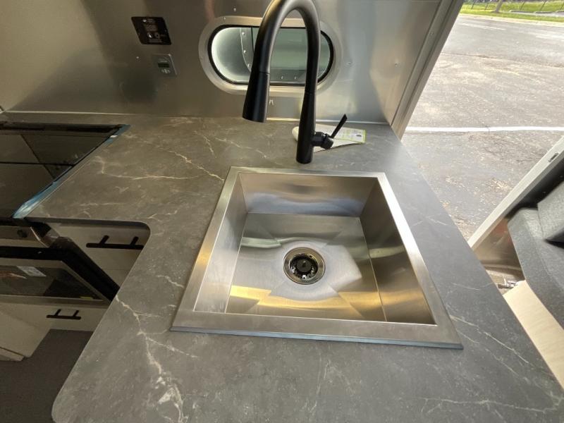 The spacious lounge and dinette area transforms easily from dining to entertainment to extra sleeping space. A fully equipped galley kitchen features premium appliances, a large stainless-steel sink, solid-surface countertops, and ample storage, making meal prep effortless. The rear bathroom offers a full shower, vanity, and generous space for getting ready in comfort. Every inch of the Flying Cloud is built with Airstream’s signature precision and attention to detail.