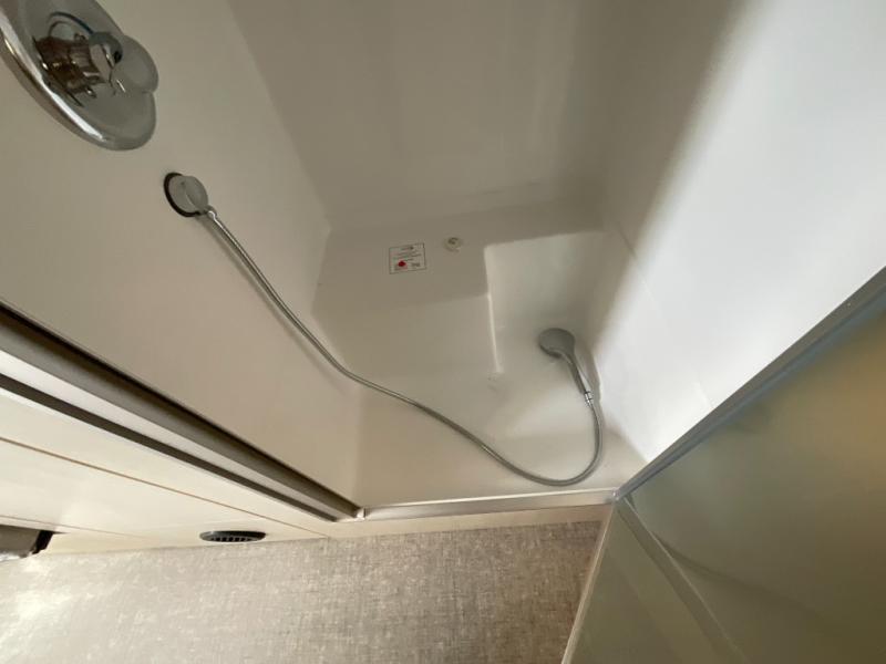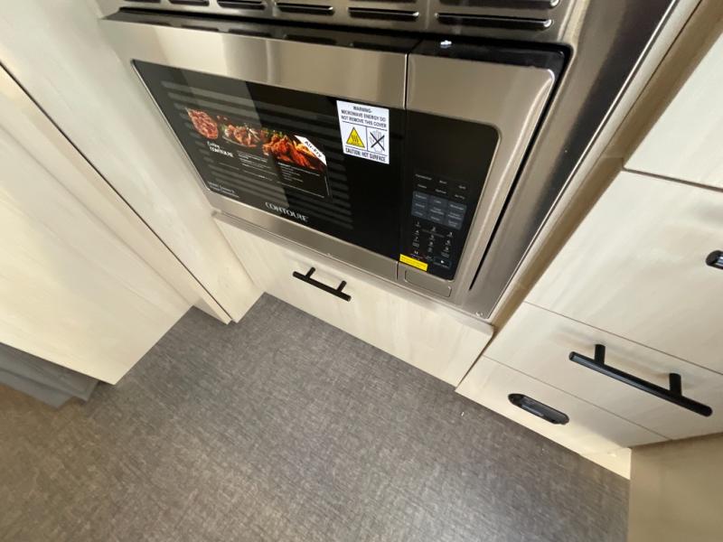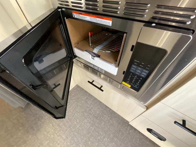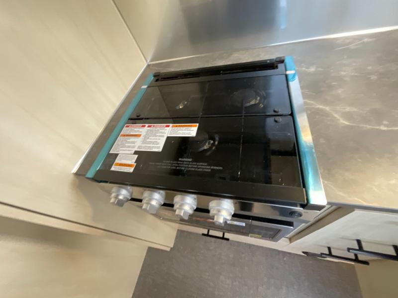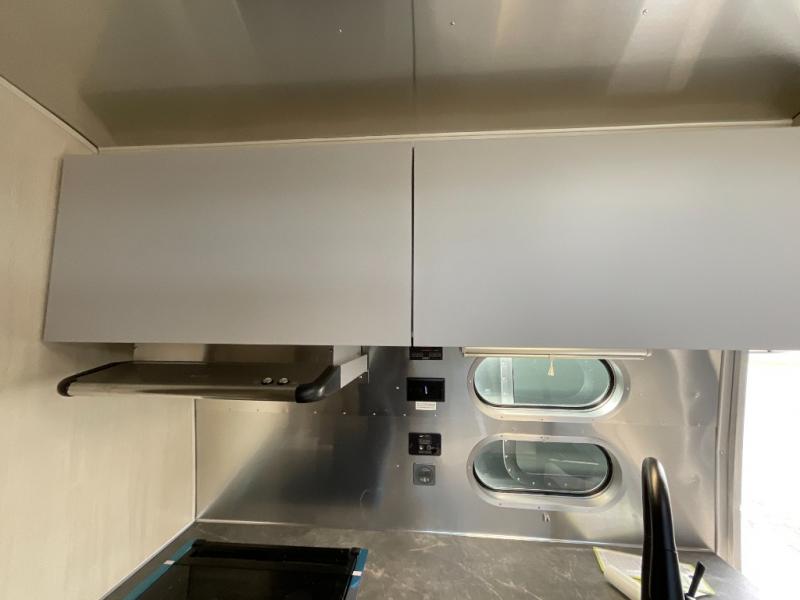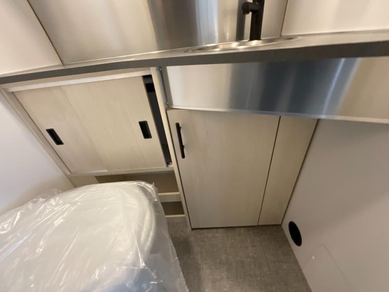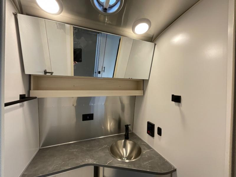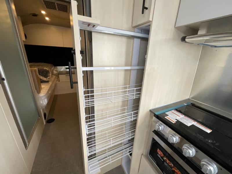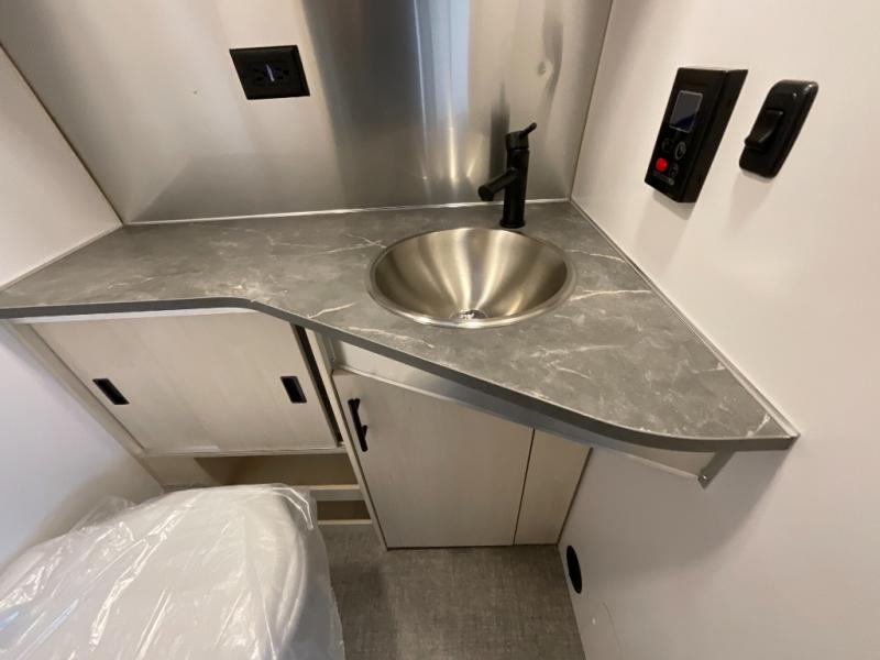 The spacious lounge and dinette area transforms easily from dining to entertainment to extra sleeping space. A fully equipped galley kitchen features premium appliances, a large stainless-steel sink, solid-surface countertops, and ample storage, making meal prep effortless. The rear bathroom offers a full shower, vanity, and generous space for getting ready in comfort. Every inch of the Flying Cloud is built with Airstream’s signature precision and attention to detail.