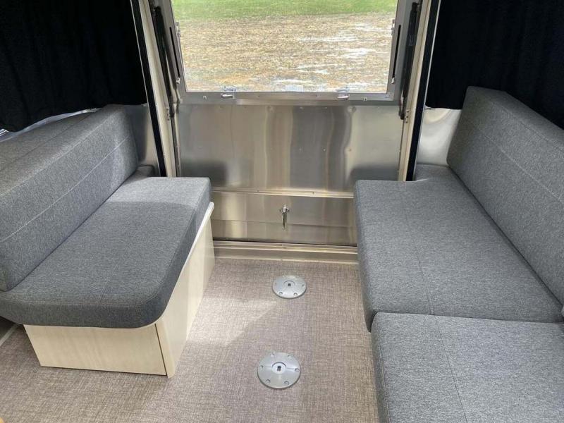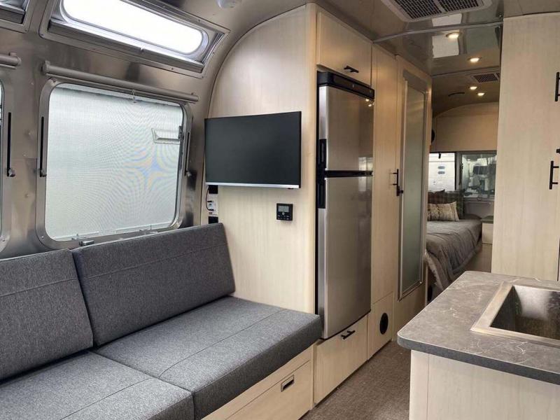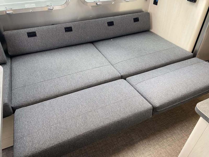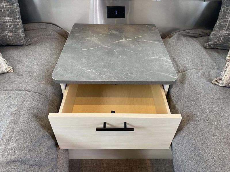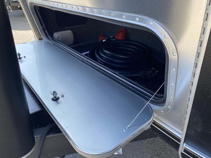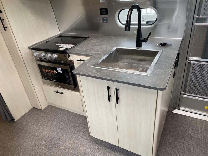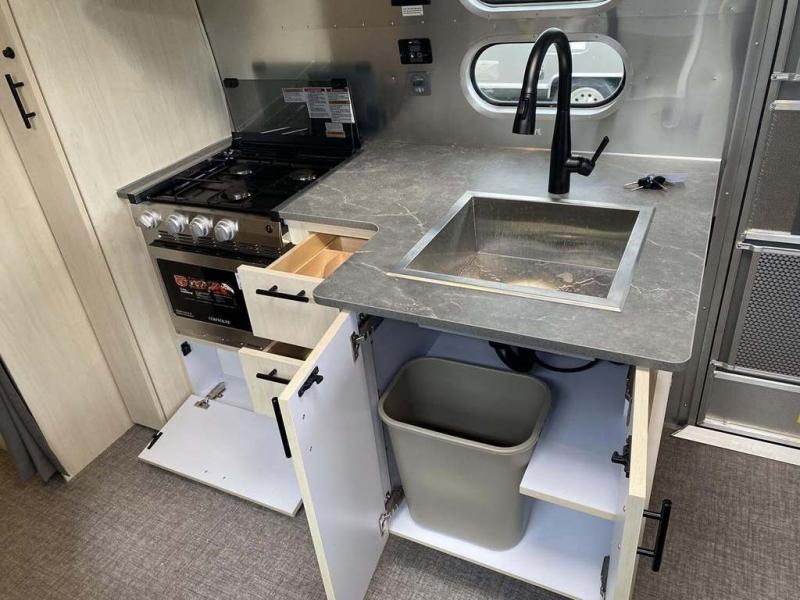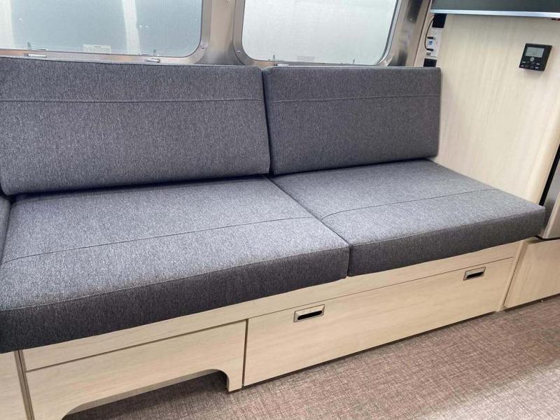 With each Flying Cloud travel trailer by Airstream, there are two axles, and each is built for ease of towing, plus there is a rear-view camera to make reversing and parking easier, and stainless steel front stone guards to protect the lower segments from road debris. The iconic Airstream design is created outside and inside by the semi-monocoque aluminum superstructure, the temperature reducing one-piece white aluminum roof, the panoramic front windows, and the stylish aluminum wheels. The interior will have you feeling right at home with handcrafted cabinetry, plenty of storage and counter space, sleek roller blinds and blackout curtains, plus residential style faucets!
