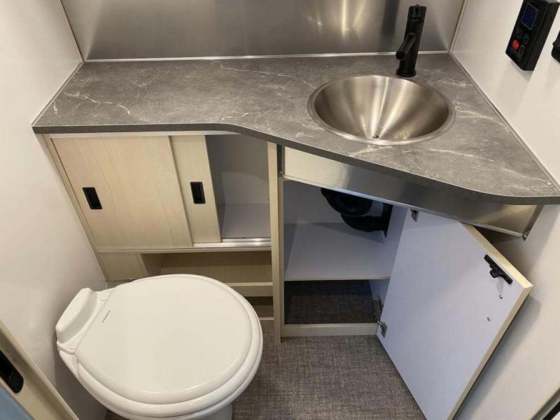 When you enjoy the finer things when traveling, this trailer will provide that for you plus lots of natural lighting and plenty of conveniences. The convertible rear dinette offers a place to dine and socialize for four, and there is a lounging area along the side with a TV on the wall. The table acts as a sturdy base below the cushions when you need some sleeping space. The front bedroom offers more panoramic windows and comfortable twin beds with a view each morning and night. There is floor space in the center and a nightstand for extra storage and charging space. You will find storage for your clothing, and a split bathroom with a half bath on one side and a shower that stands independently across the hall. And the kitchen offers everything you need to make meals including extra counter space and a refrigerator for leftovers. And there is a rear hatch option for this trailer. The Midnight Flamingo optional upgrade is also available on this model for even more striking style and functional upgrades!