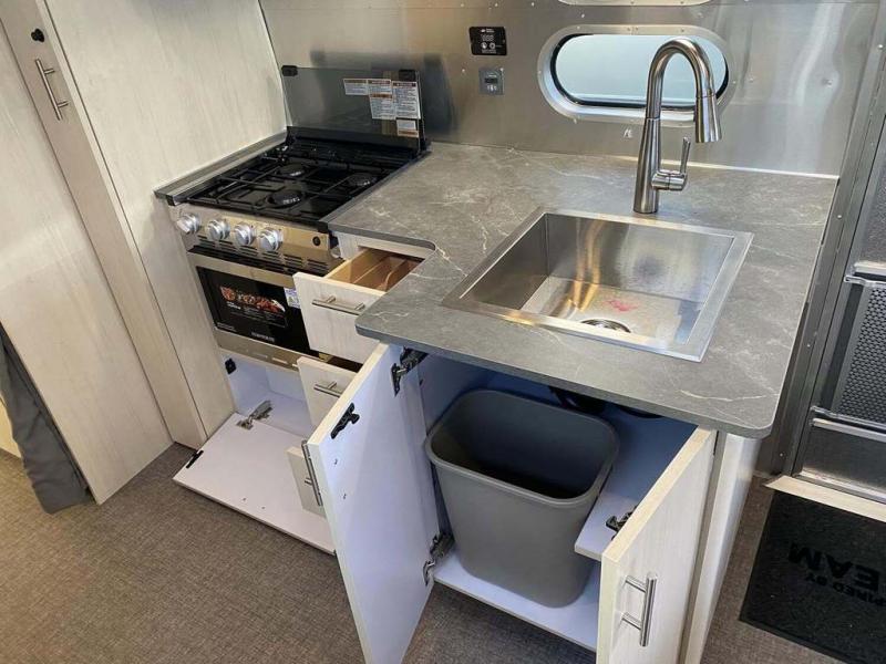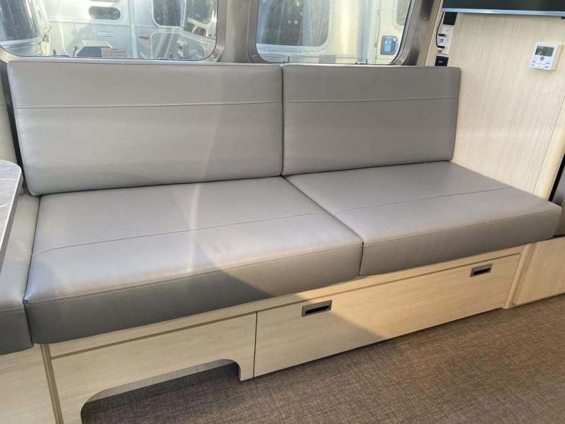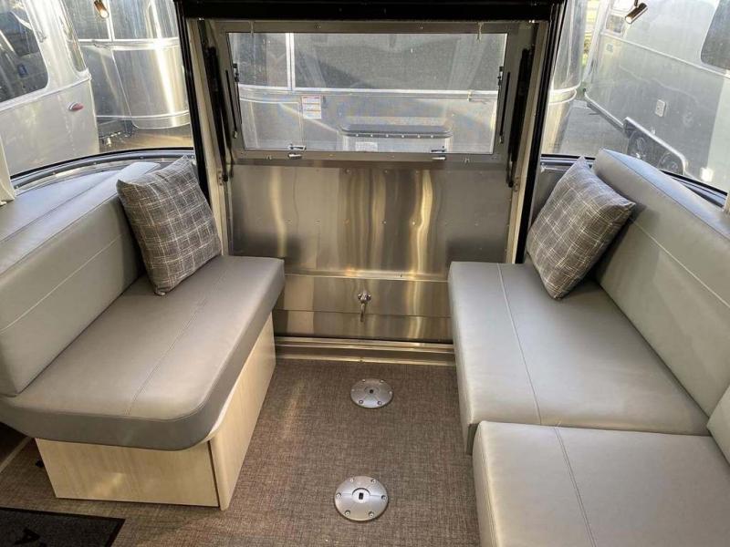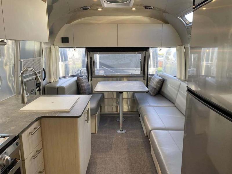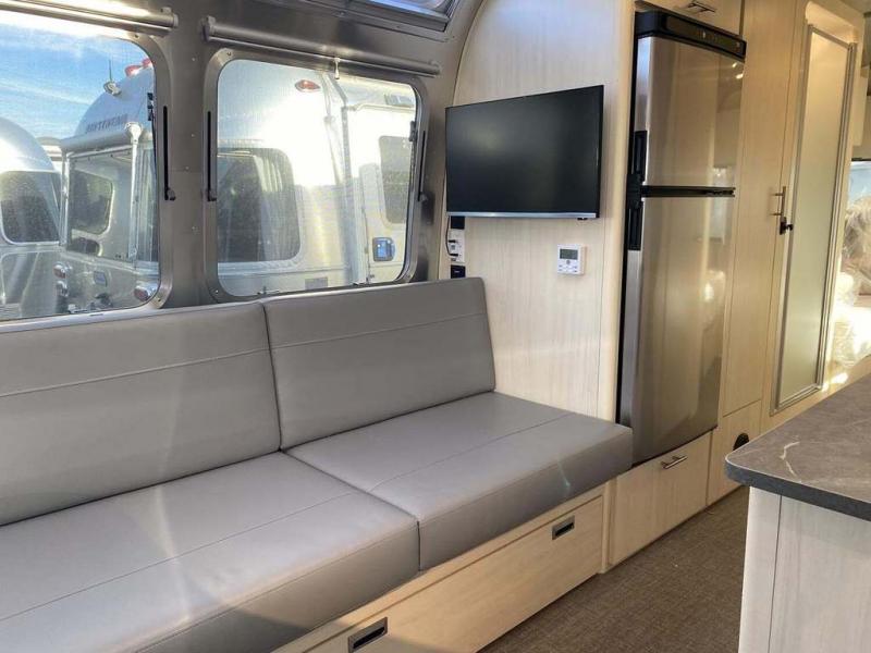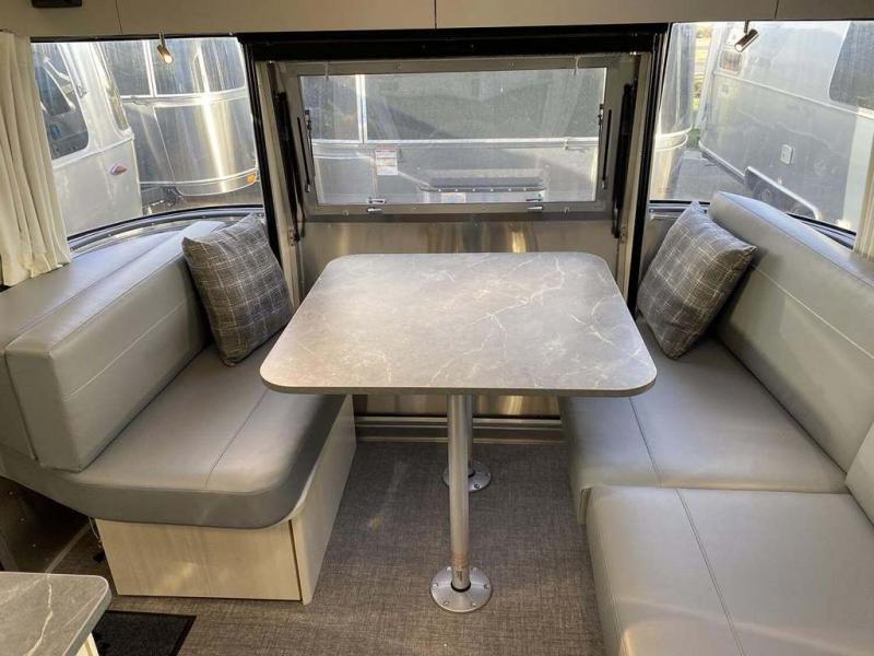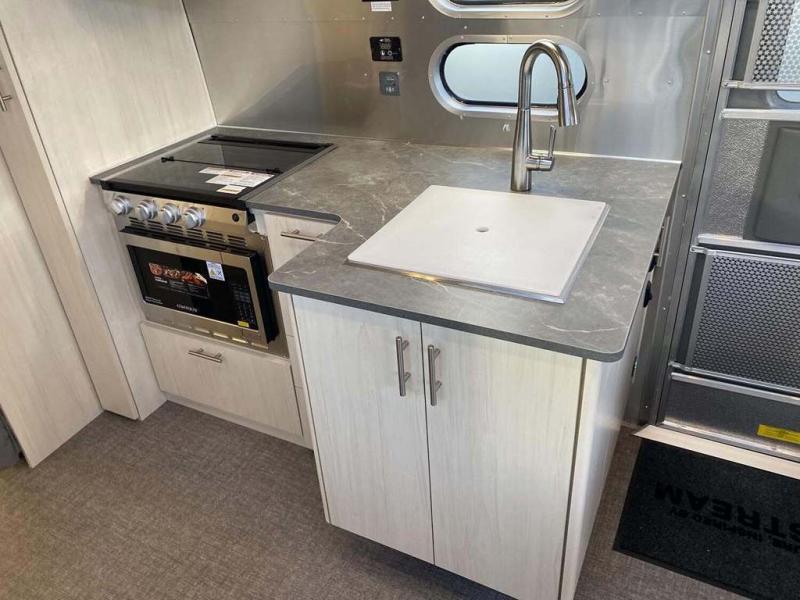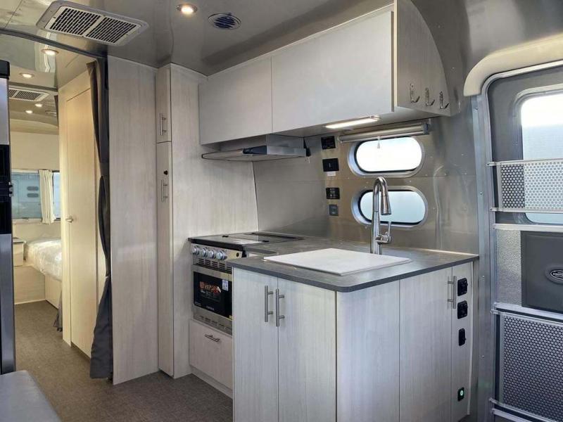 With each Flying Cloud travel trailer by Airstream, there are two axles, and each is built for ease of towing, plus there is a rear-view camera to make reversing and parking easier, and stainless steel front stone guards to protect the lower segments from road debris. The iconic Airstream design is created outside and inside by the semi-monocoque aluminum superstructure, the temperature reducing one-piece white aluminum roof, the panoramic front windows, and the stylish aluminum wheels. The interior will have you feeling right at home with handcrafted cabinetry, plenty of storage and counter space, sleek roller blinds and blackout curtains, plus residential style faucets!