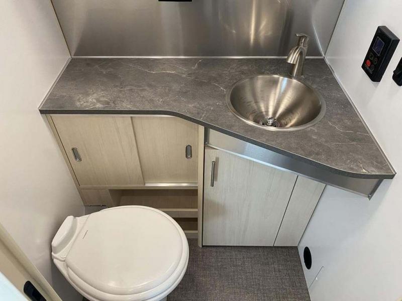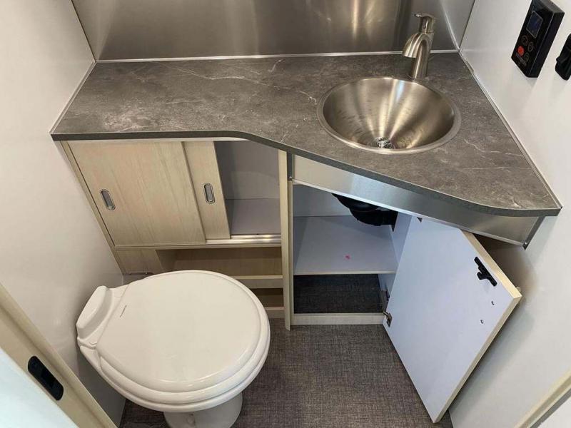 When you enjoy the finer things when traveling, this trailer will provide that for you plus lots of natural lighting and plenty of conveniences. The convertible rear dinette offers a place to dine and socialize for four, and there is a lounging area along the side with a TV on the wall. The table acts as a sturdy base below the cushions when you need some sleeping space. The front bedroom offers more panoramic windows and comfortable twin beds with a view each morning and night. There is floor space in the center and a nightstand for extra storage and charging space. You will find storage for your clothing, and a split bathroom with a half bath on one side and a shower that stands independently across the hall. And the kitchen offers everything you need to make meals including extra counter space and a refrigerator for leftovers. And there is a rear hatch option for this trailer. The Midnight Flamingo optional upgrade is also available on this model for even more striking style and functional upgrades!