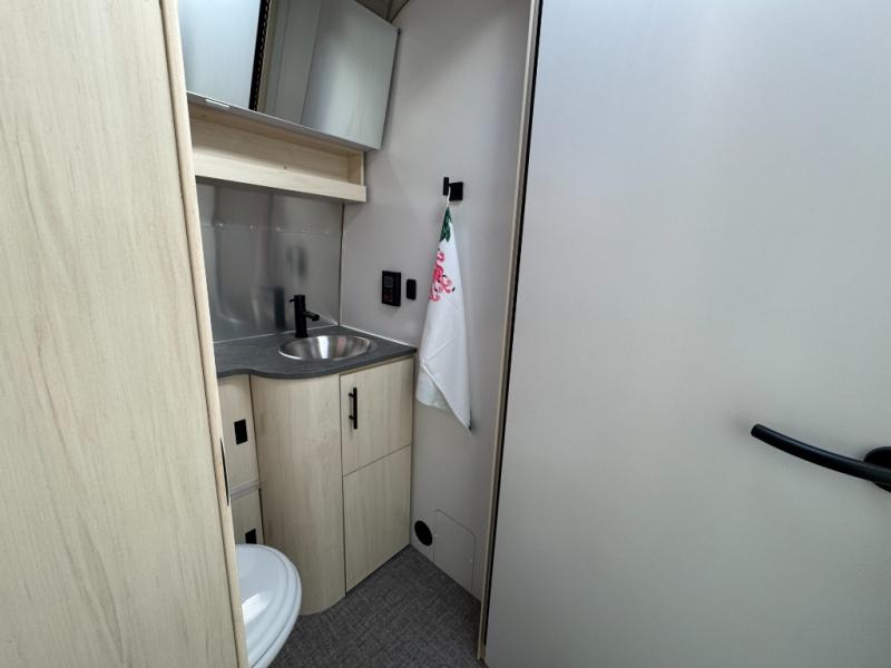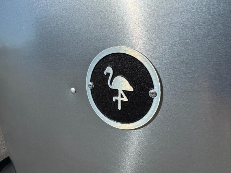 Whether you stay at a campground or an RV park, you will love relaxing inside on the comfortable furniture and the pillowtop memory foam mattress while gazing out all the windows and enjoying the natural lighting. The front master bedroom offers two nightstands for perfect storage for small items and books, and the counters are perfect for displaying accessories and charging devices, while the dinette and lounging area can easily be converted into sleeping space when you have guests stay the night. The toilet and vanity are separate from the independent shower allowing two people to use the facilities at once. And the cook will have a spacious galley to make meals using the stove/microwave area with stainless steel sink, and the refrigerator can hold the leftovers that is opposite the stove. And you might even like to add a few options such as a front bunk option over the queen bed, an optional rear hatch, or optional twin beds in place of the queen bed! The Midnight Flamingo optional upgrade is also available on this model for even more striking style and functional upgrades!