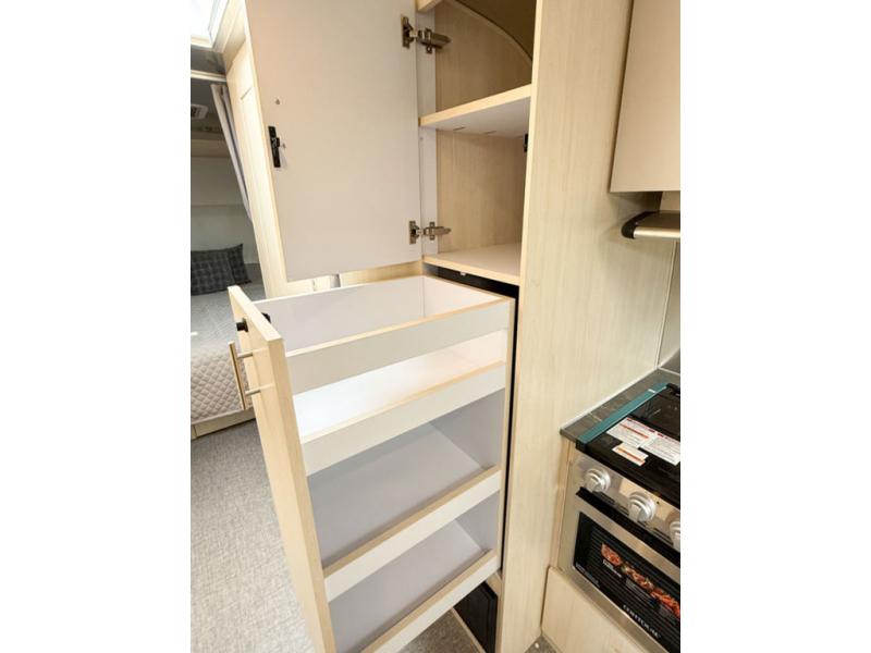 Whether you stay at a campground or an RV park, you will love relaxing inside on the comfortable furniture and the pillowtop memory foam mattress while gazing out all the windows and enjoying the natural lighting. The front master bedroom offers two nightstands for perfect storage for small items and books, and the counters are perfect for displaying accessories and charging devices, while the dinette and lounging area can easily be converted into sleeping space when you have guests stay the night. The toilet and vanity are separate from the independent shower allowing two people to use the facilities at once. And the cook will have a spacious galley to make meals using the stove/microwave area with stainless steel sink, and the refrigerator can hold the leftovers that is opposite the stove. And you might even like to add a few options such as a front bunk option over the queen bed, an optional rear hatch, or optional twin beds in place of the queen bed! The Midnight Flamingo optional upgrade is also available on this model for even more striking style and functional upgrades!