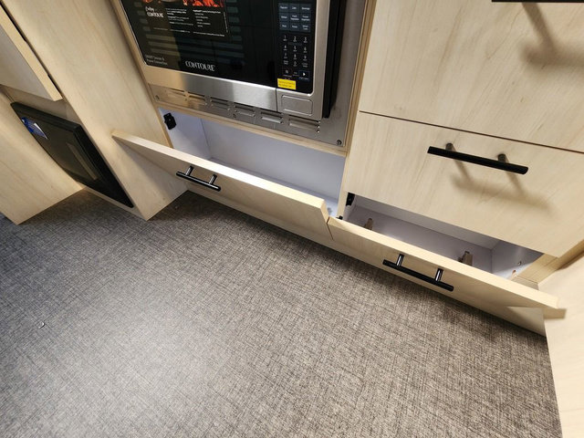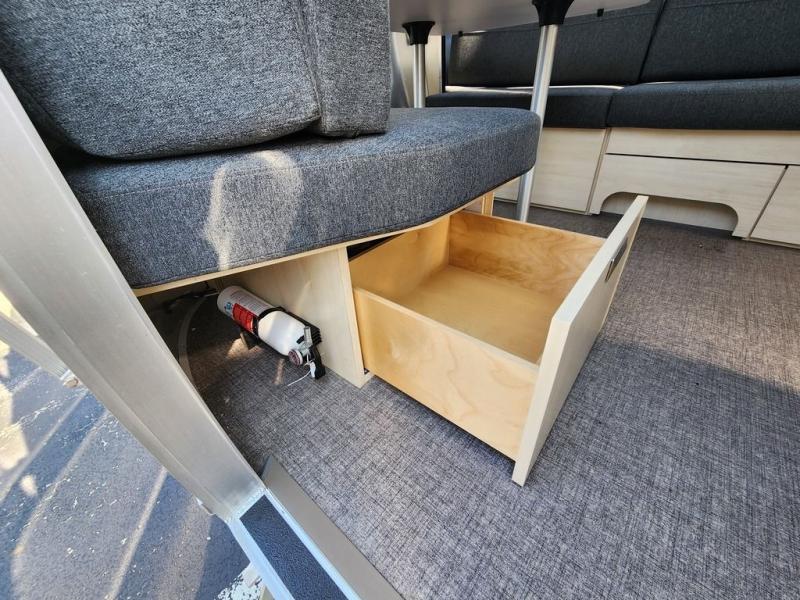 Whether you stay at a campground or an RV park, you will love relaxing inside on the comfortable furniture and the pillowtop memory foam mattress while gazing out all the windows and enjoying the natural lighting. The front master bedroom offers two nightstands for perfect storage for small items and books, and the counters are perfect for displaying accessories and charging devices, while the dinette and lounging area can easily be converted into sleeping space when you have guests stay the night. The toilet and vanity are separate from the independent shower allowing two people to use the facilities at once. And the cook will have a spacious galley to make meals using the stove/microwave area with stainless steel sink, and the refrigerator can hold the leftovers that is opposite the stove. And you might even like to add a few options such as a front bunk option over the queen bed, an optional rear hatch, or optional twin beds in place of the queen bed! The Midnight Flamingo optional upgrade is also available on this model for even more striking style and functional upgrades!