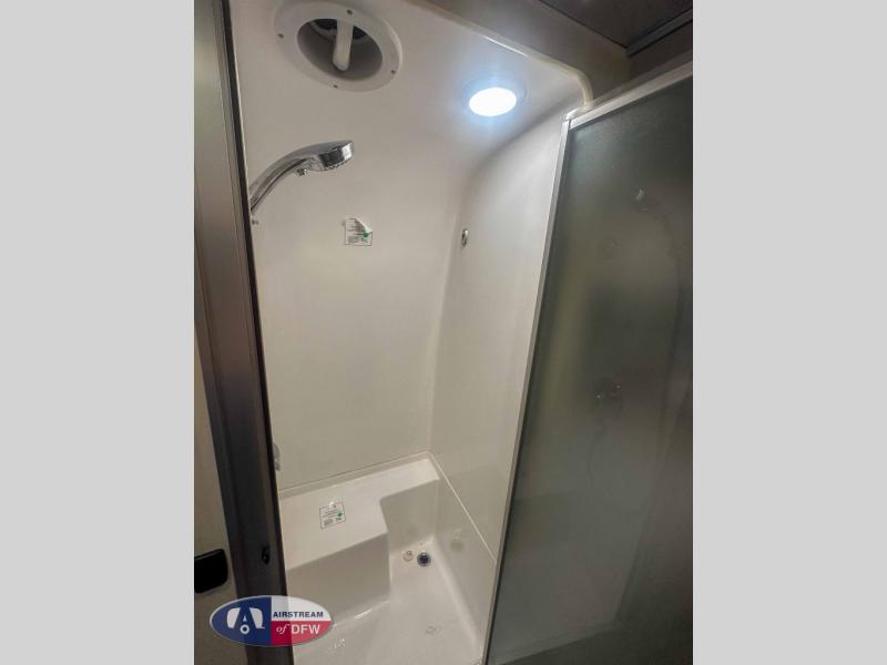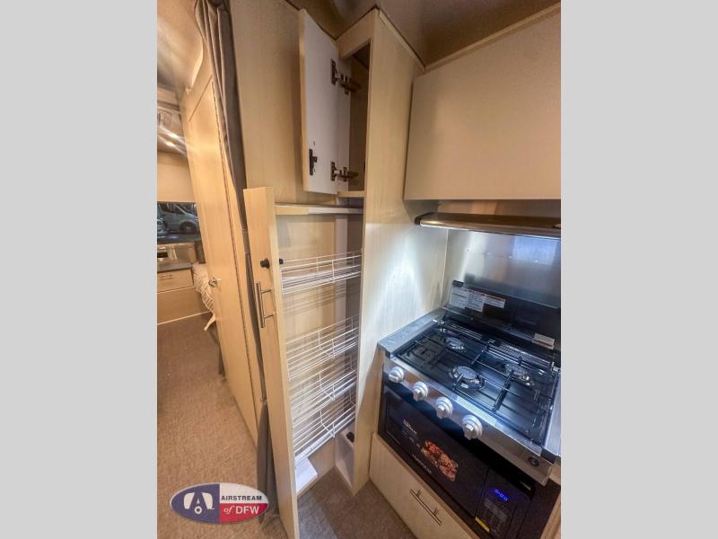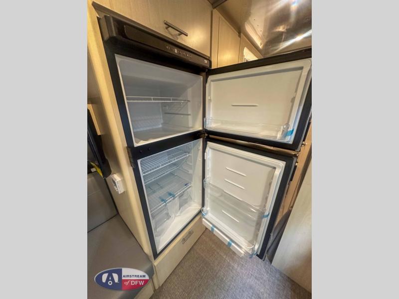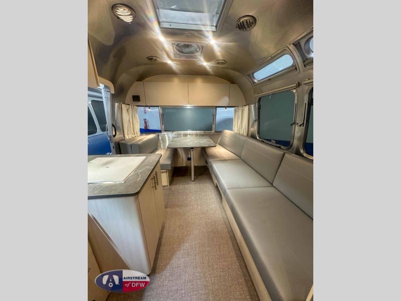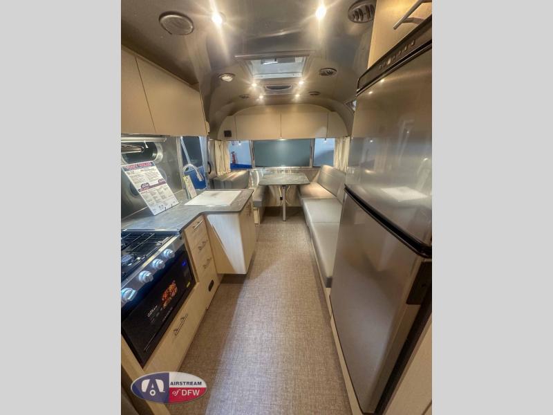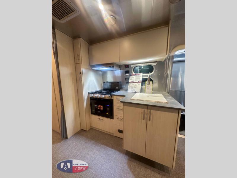 With each Flying Cloud travel trailer by Airstream, there are two axles, and each is built for ease of towing, plus there is a rear-view camera to make reversing and parking easier, and stainless steel front stone guards to protect the lower segments from road debris. The iconic Airstream design is created outside and inside by the semi-monocoque aluminum superstructure, the temperature reducing one-piece white aluminum roof, the panoramic front windows, and the stylish aluminum wheels. The interior will have you feeling right at home with handcrafted cabinetry, plenty of storage and counter space, sleek roller blinds and blackout curtains, plus residential style faucets!