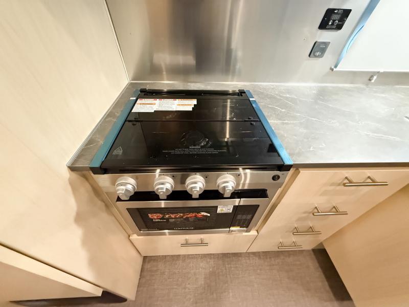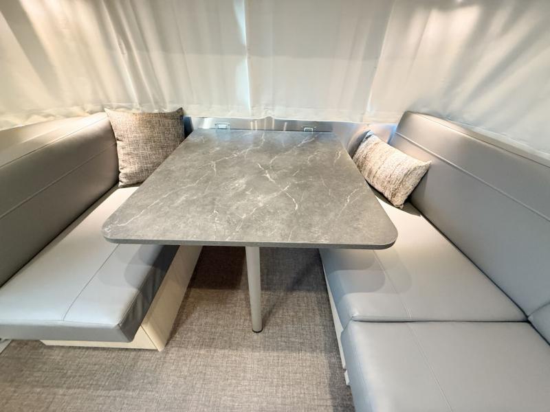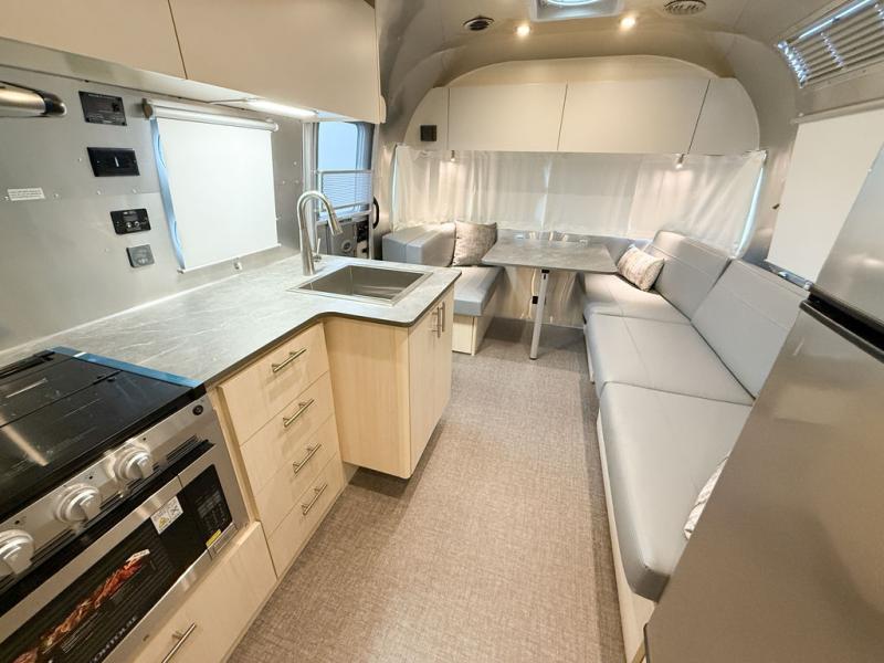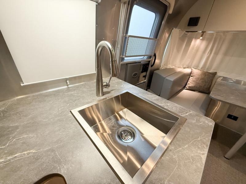With each Flying Cloud travel trailer by Airstream, there are two axles, and each is built for ease of towing, plus there is a rear-view camera to make reversing and parking easier, and stainless steel front stone guards to protect the lower segments from road debris. The iconic Airstream design is created outside and inside by the semi-monocoque aluminum superstructure, the temperature reducing one-piece white aluminum roof, the panoramic front windows, and the stylish aluminum wheels. The interior will have you feeling right at home with handcrafted cabinetry, plenty of storage and counter space, sleek roller blinds and blackout curtains, plus residential style faucets!
